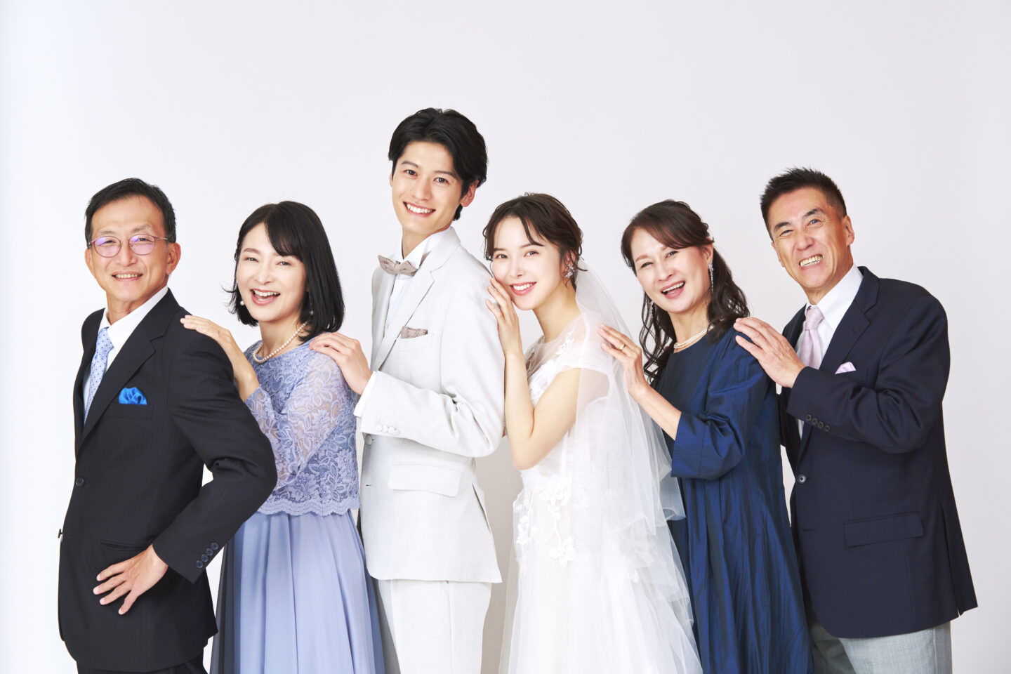 撮りたいポーズや構造があれば、イメージ写真等を撮影者・参加者と共有しておきましょう。人数が多い場合は、当日スムーズに撮影できるよう事前に並び順を決めておくと撮影当日に焦らないで撮影に集中できますよ。両家と撮影する場合は、新郎新婦を中心に撮影者から見て右側に新郎家族、左側に新婦家族とし、血縁が遠い順で並びましょう。友人も参加する場合は、親族の後ろに並ぶのが基本ですので、並び順に迷った際は参考にしてみてください。
