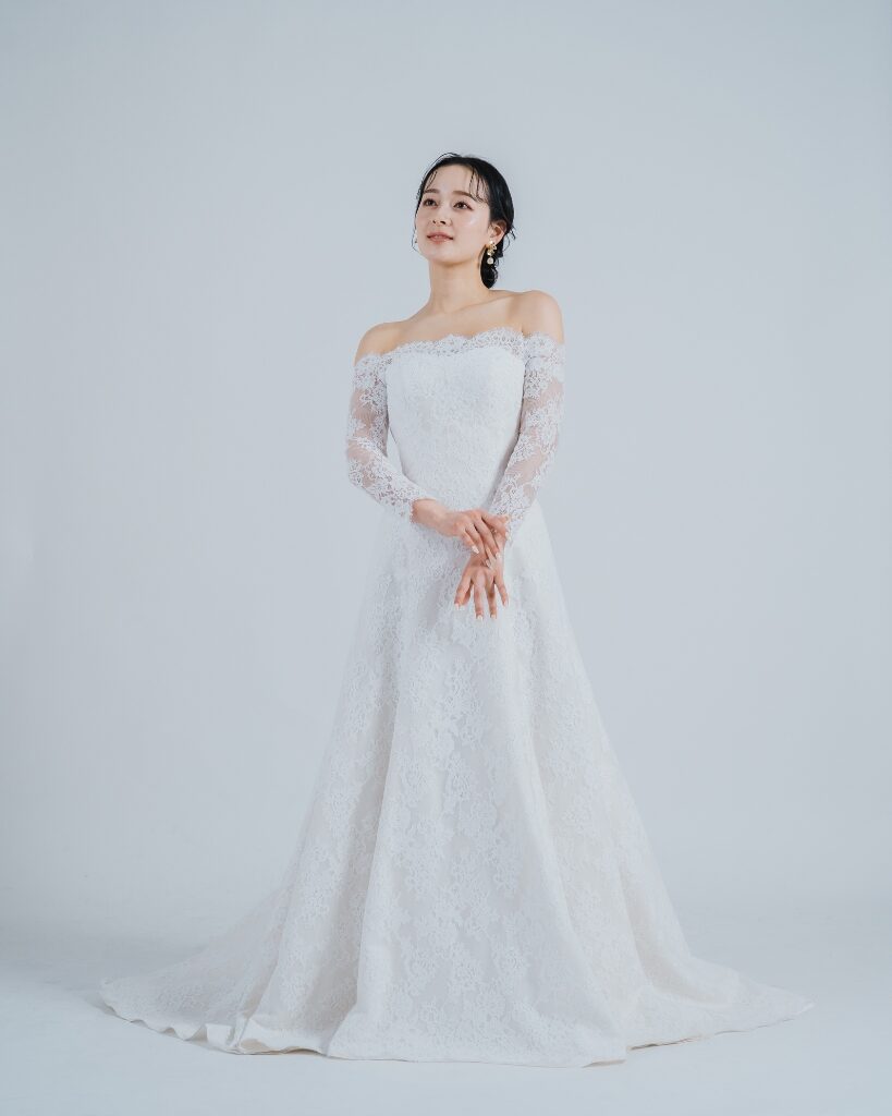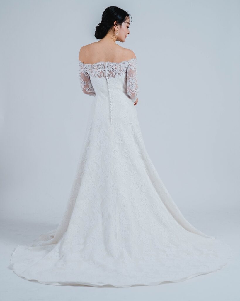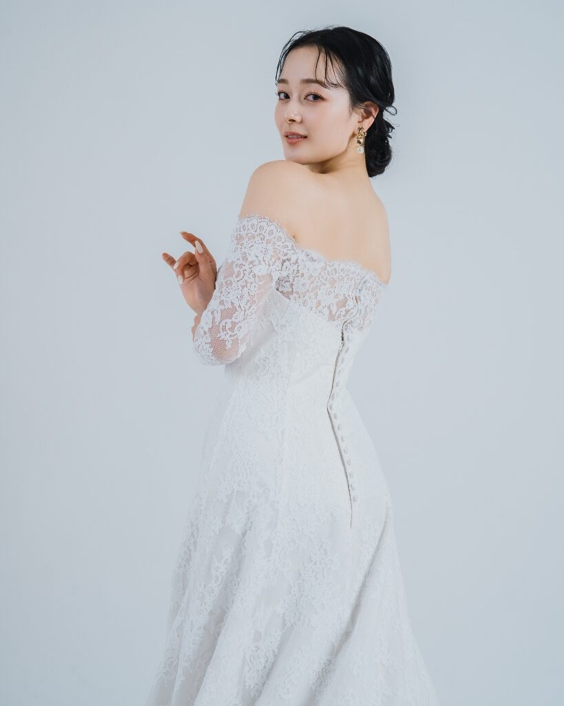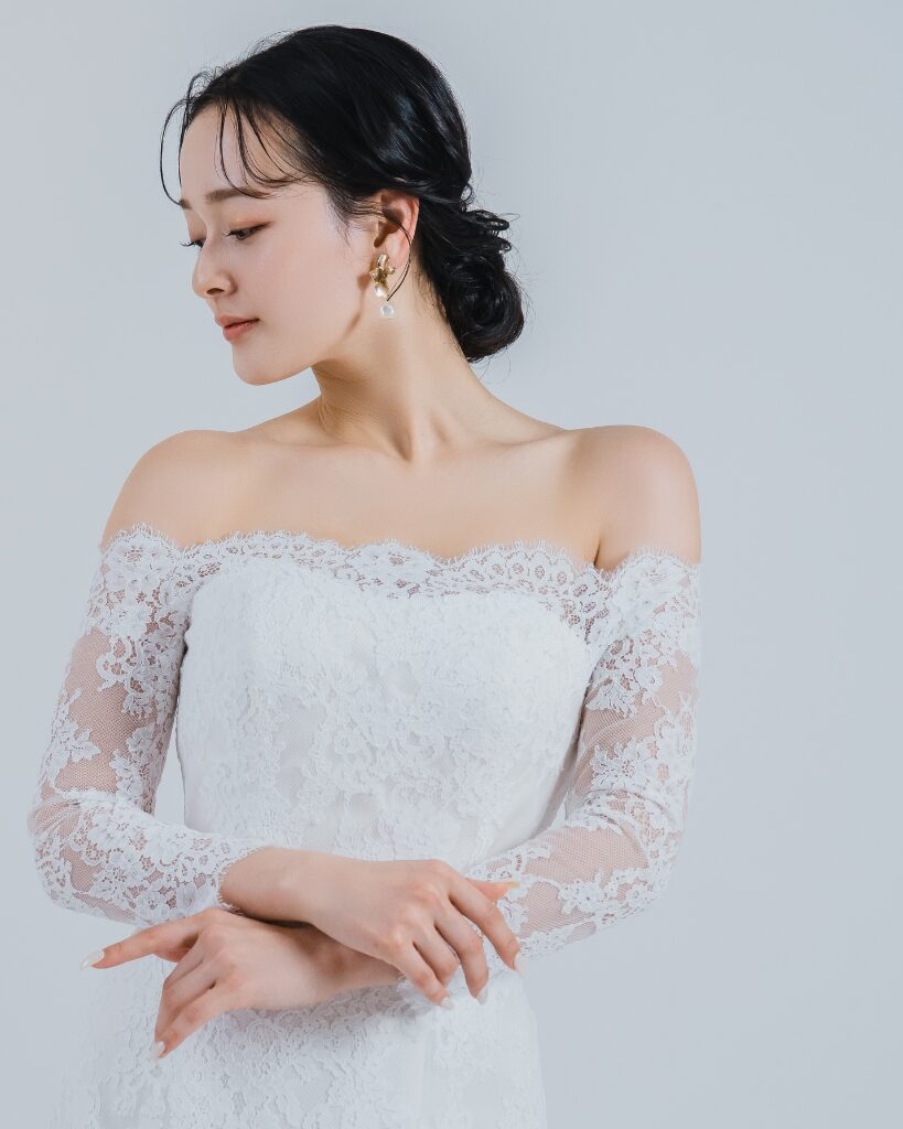 王道のクラシックデザインをデコルテを際立たせることでモダンに演出したスレンダーラインドレス。繊細なレース使いが女性らしい柔らかさを引き立てます。