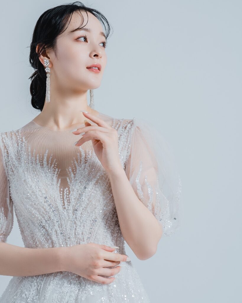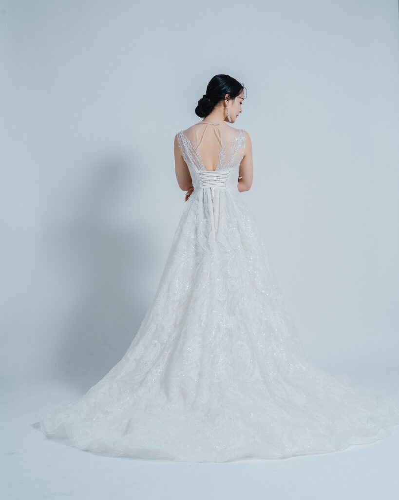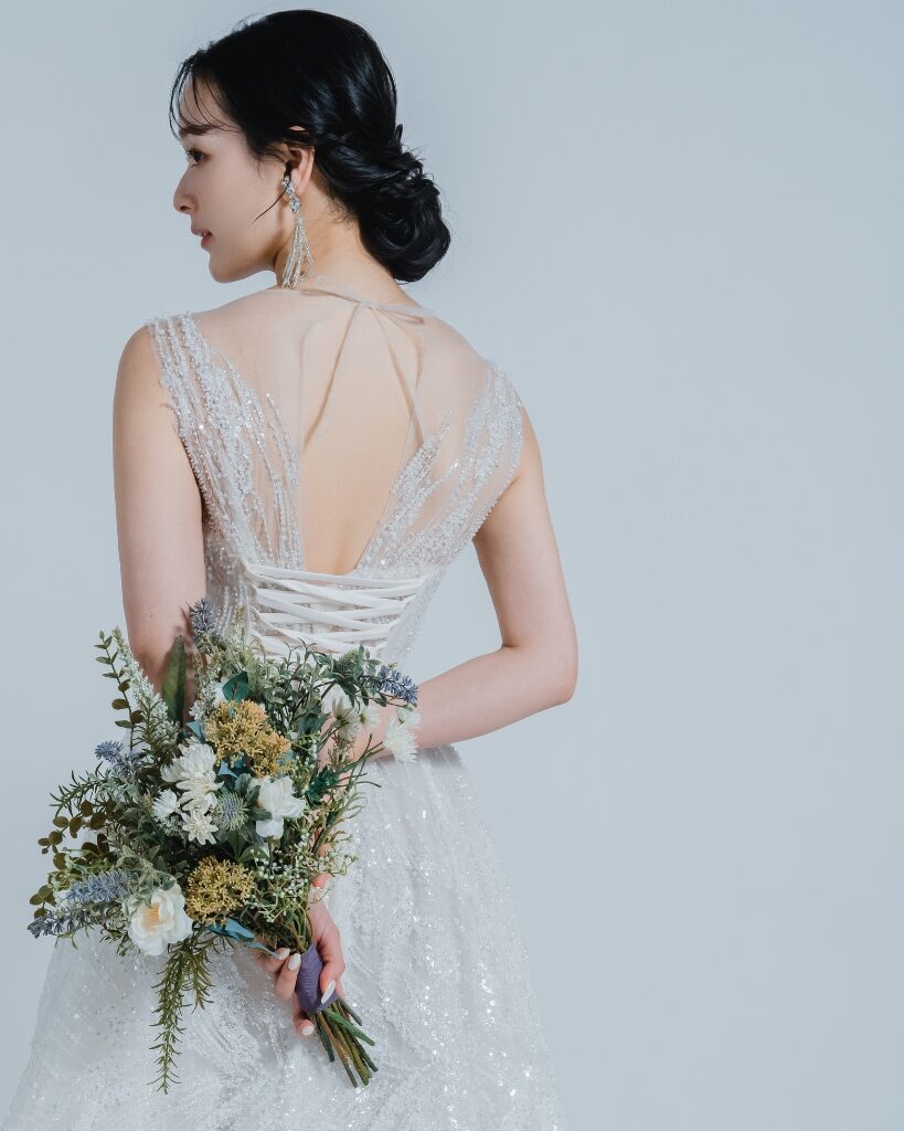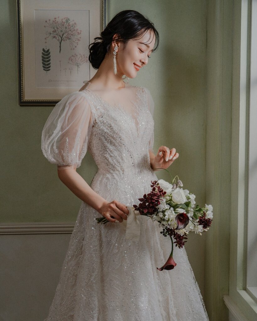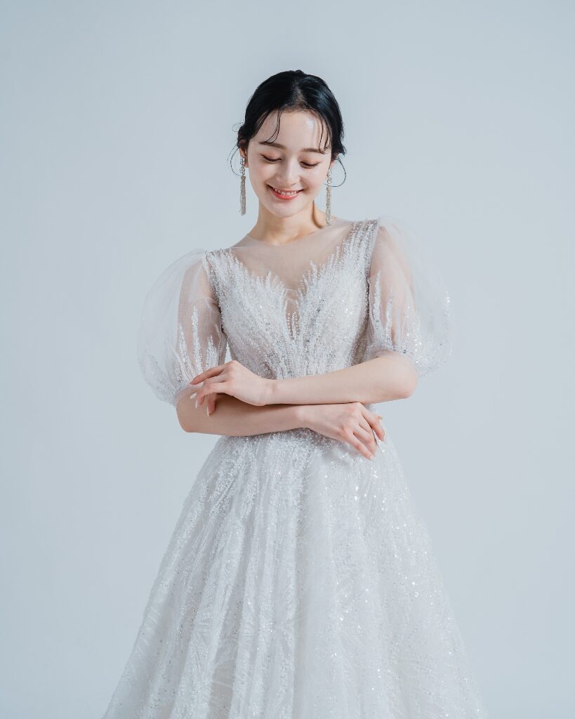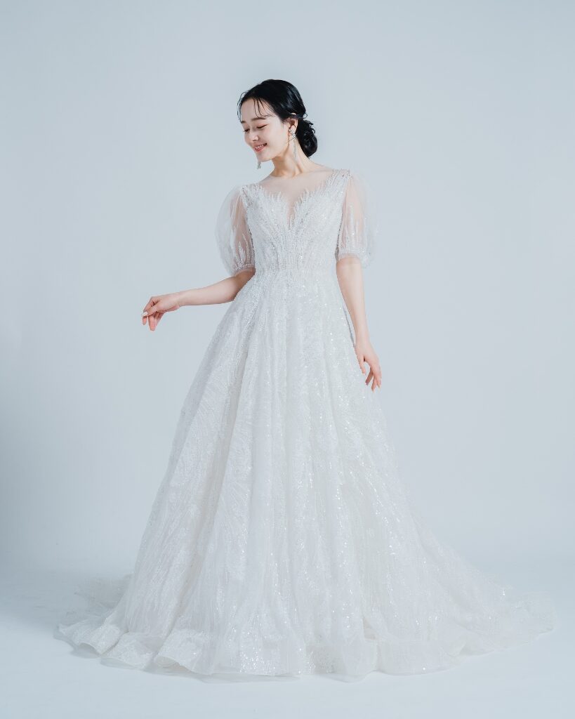 エレガントなAラインの純白ドレス。繊細なアイディールと流れるようなビジューラインが視長効果を発揮し、スタイルアップを実現してくれます