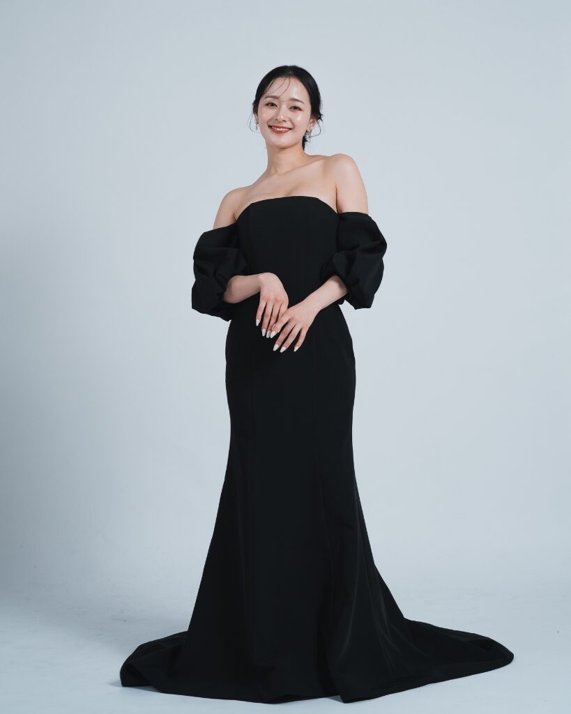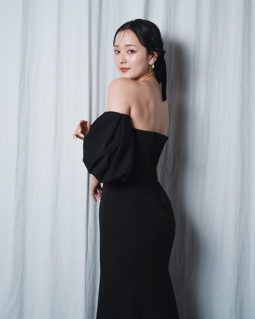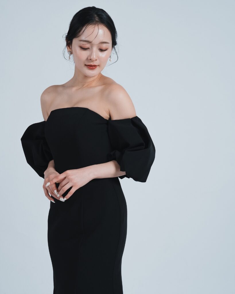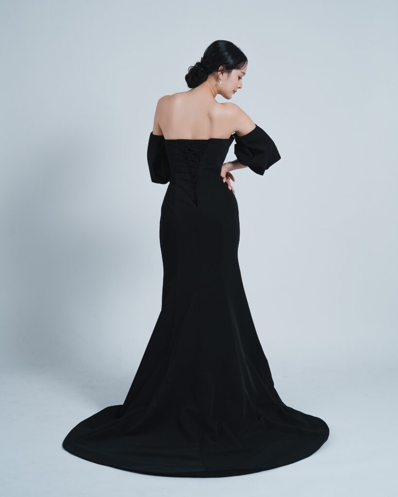 トレンドのブラックドレス。装飾をすべて削ぎ落し、ブーケ・ヘアメイク・アクセサリーによって完成する1着。パフスリーブは取り外しができるため究極のミニマルスタイルも可能です。