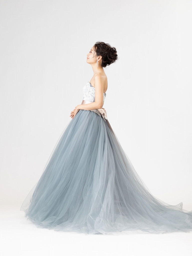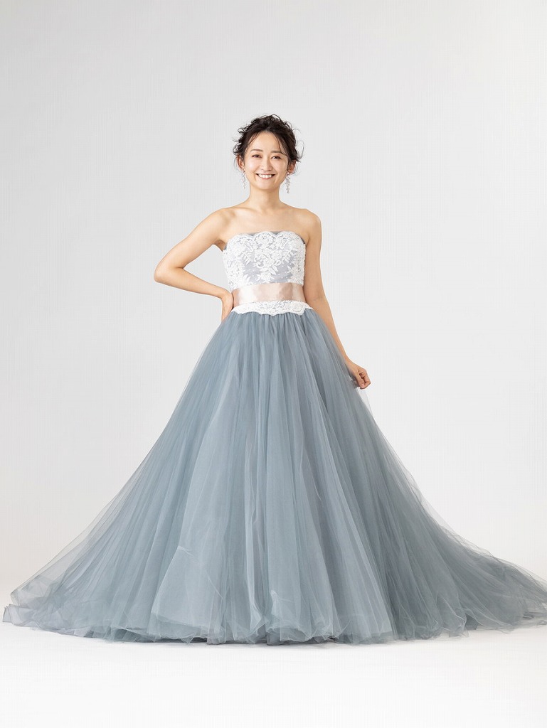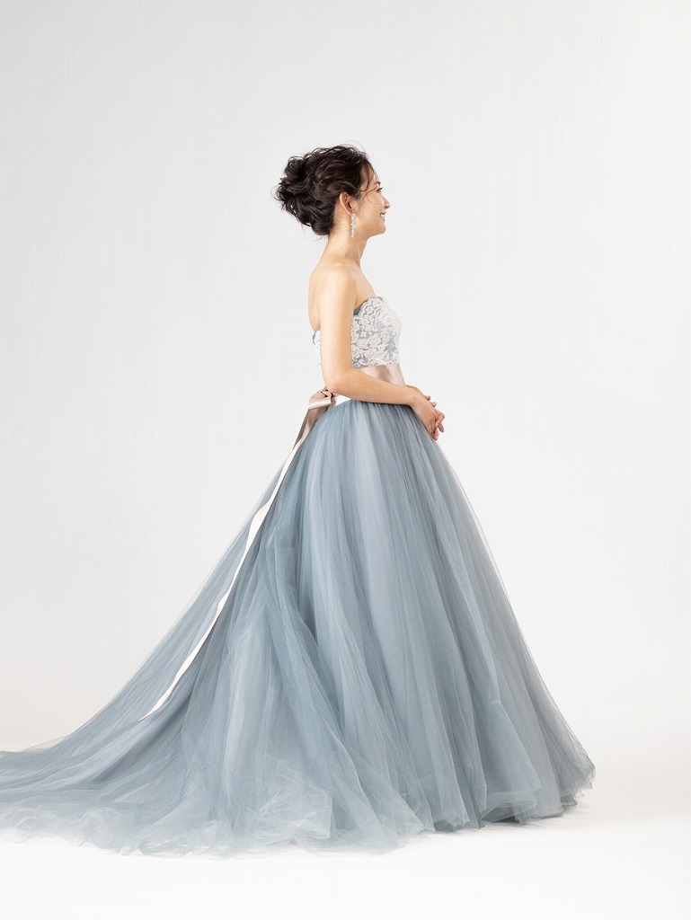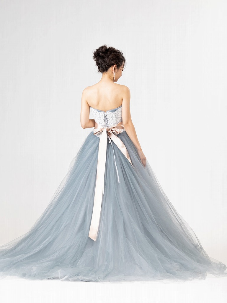 大人っぽいくすみカラーの中にもピンクベージュの色味のリボンで甘さを加えたデザインになっています。繊細な刺繍はウエスト位置をマークしてくれるのでスタイルアップも叶えてくれるドレスです。