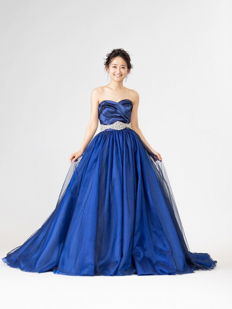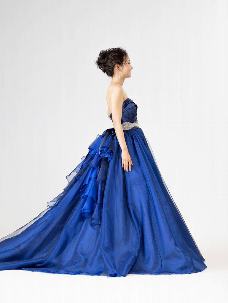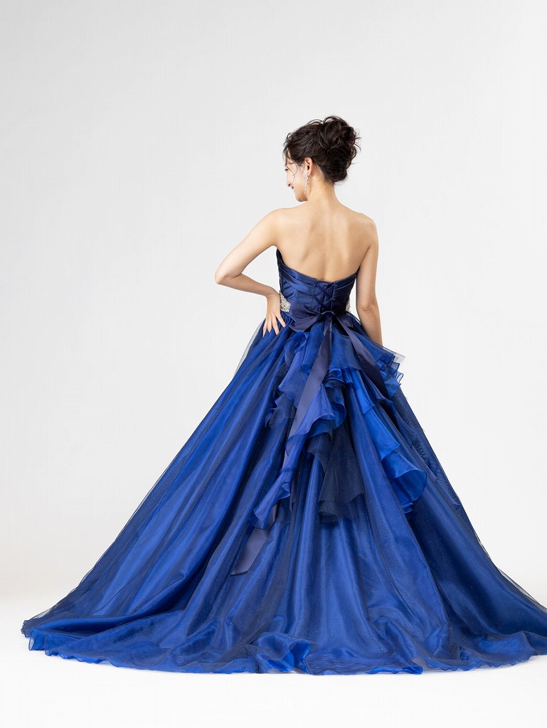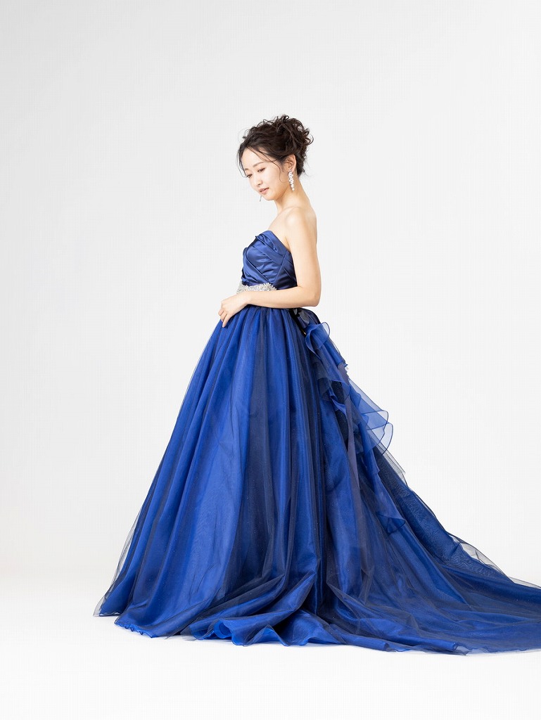 青色のサテンの上にブラックのチュールがかかったデザイン性が高い1着です。深い青色がチュールの動きによってグラデーションになり、楽しめるドレスとなっております。