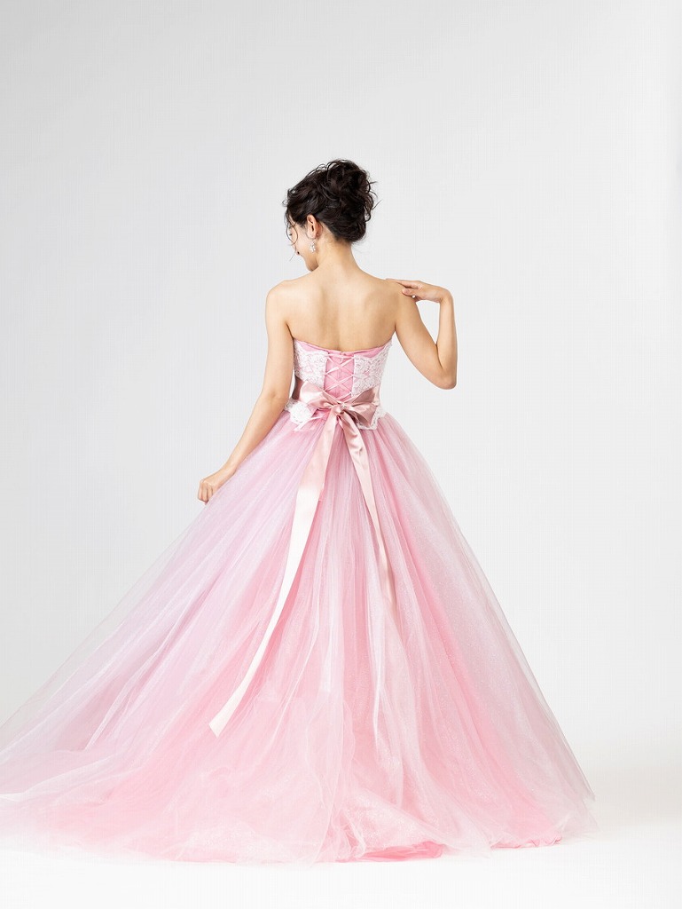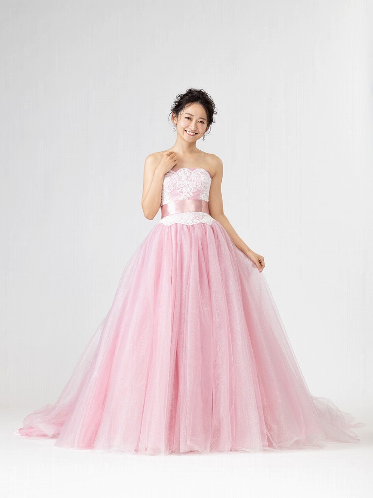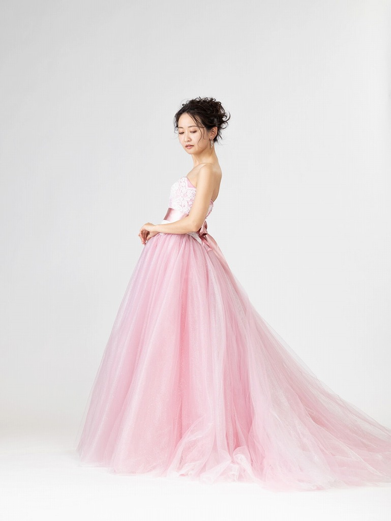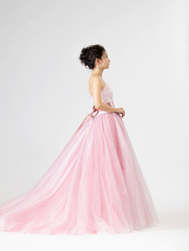 パステルカラーのピンク色はふわっとしたヘアスタイルと相性が抜群です。幅広の存在感があるリボンでウエストマークをすることでよりスタッフアップもさせてくれるデザインです。