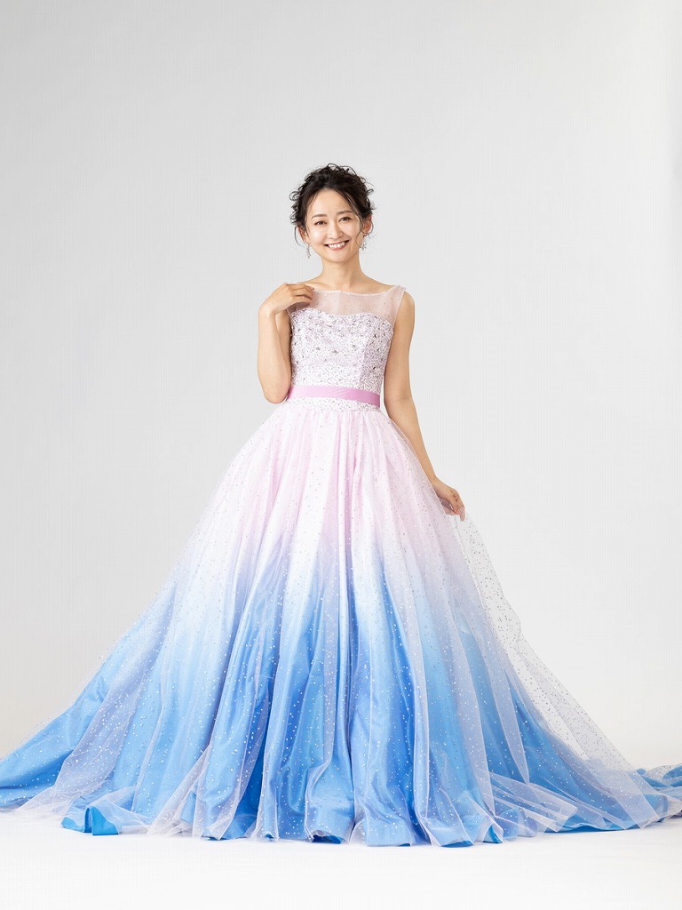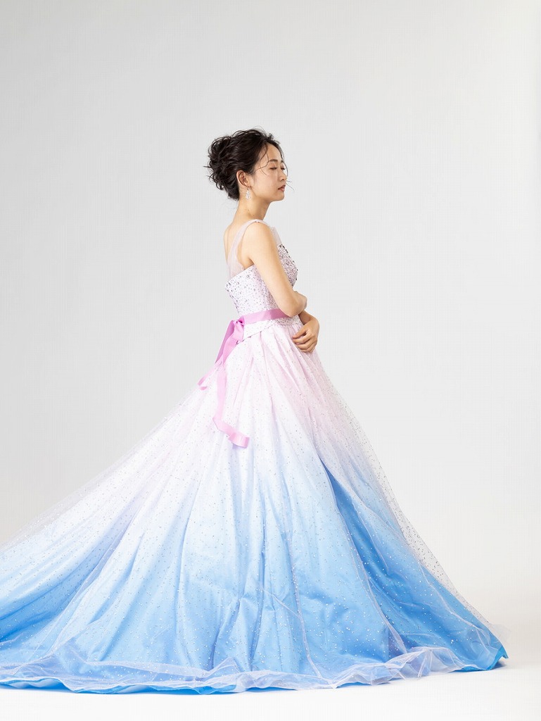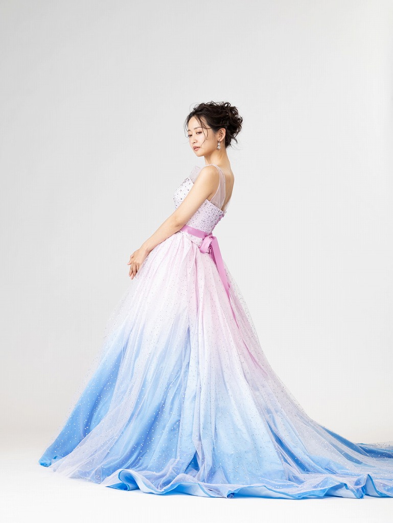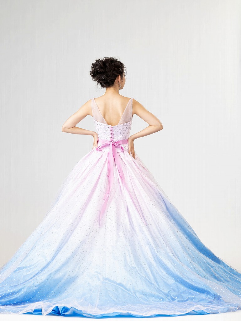 だんだんと変わっていくグラデーションカラーは、デザイン性が高い特別な1着。髪型やアクセサリーとの組み合わせを考えるのもとても楽しい、可能性が溢れるドレスです。