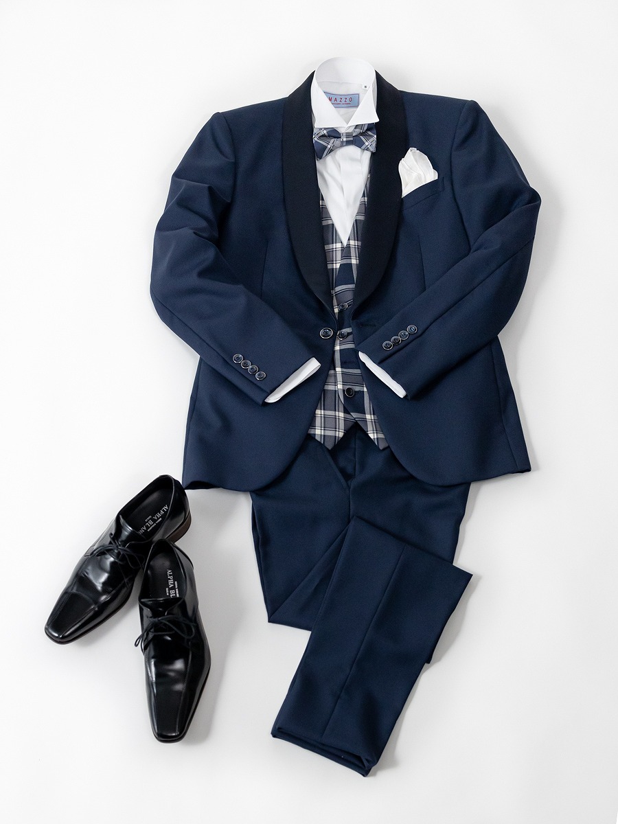 ネイビーのシックなタキシードにチェック柄を合わせた1着。ベストの柄も落ち着いた色味のチェック柄になので、ジャケットを脱いだスタイルでもドレスとのバランスが良いタキシードです。お好きなカラーシャツを合わせると一気にカジュアルなスタイルに早変わり。淡いデニムシャツやアースカラーもおすすめです。