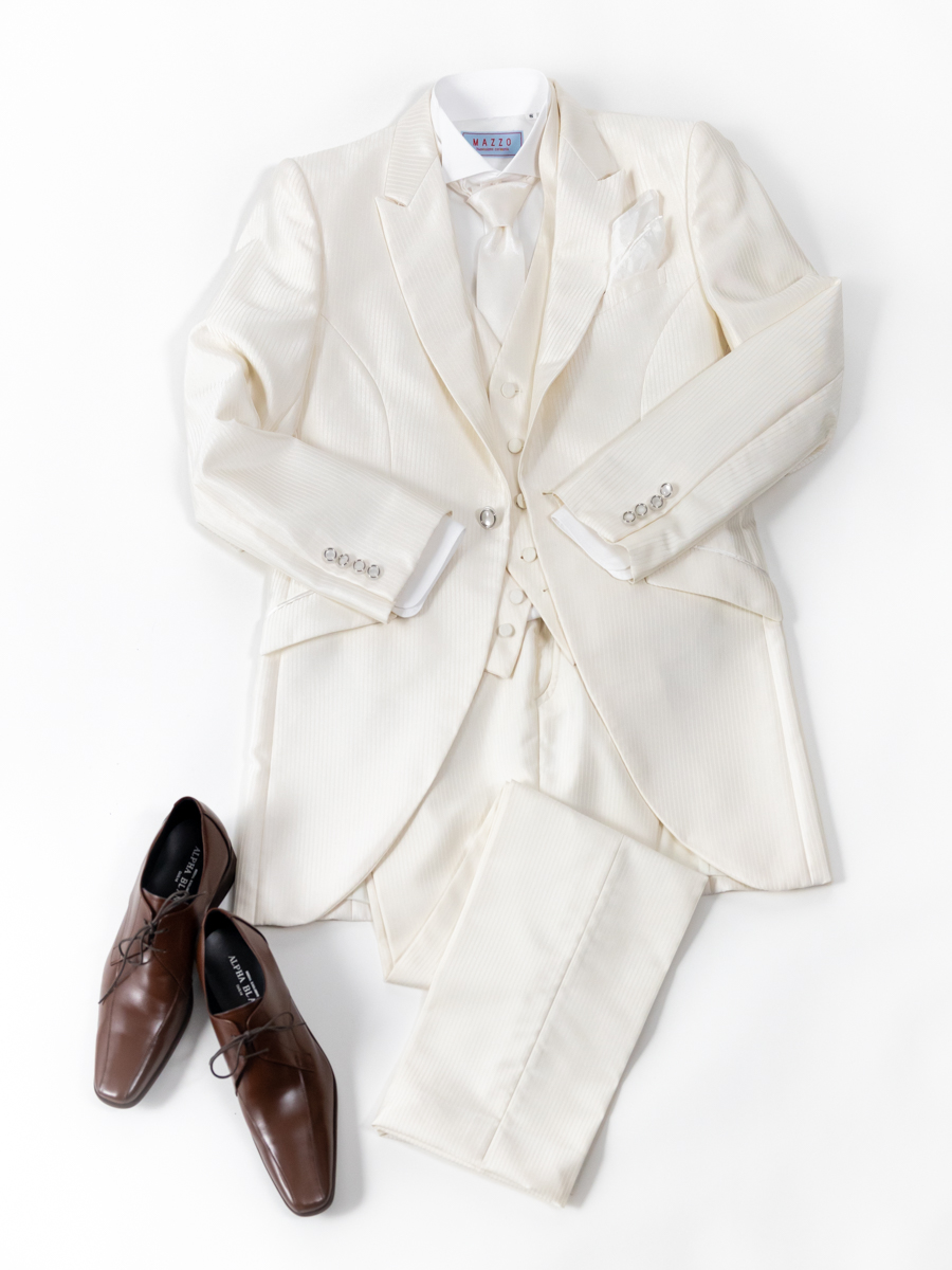 定番のシンプルなホワイトのタキシード。ジャケットは後ろが少し長く、前裾は斜めに丸くカットされたモーニングカットをしておりよりクラシカルな印象に。ブラウンや黒のシューズを合わせることでカジュアル感がプラスされ、スタジオセットとのバランスも良くなります。