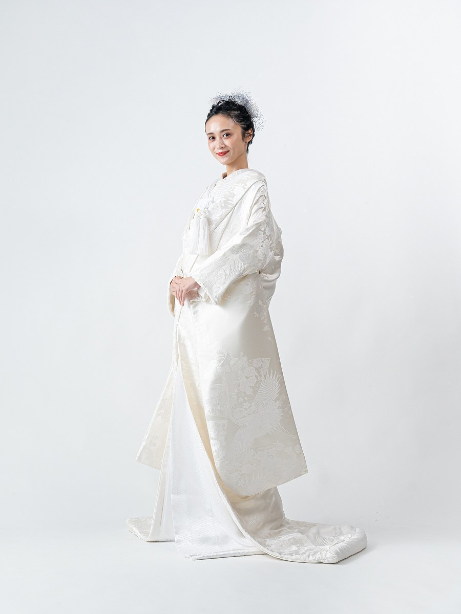 牡丹や鶴など、とても縁起の良い華やかな柄行きの白無垢。大胆に咲く牡丹は、小さな蕾から大きな花を咲かせることから牡丹の柄は富貴を象徴しています。上品に輝く刺繍は花嫁の透き通った美しさを引き立てます。