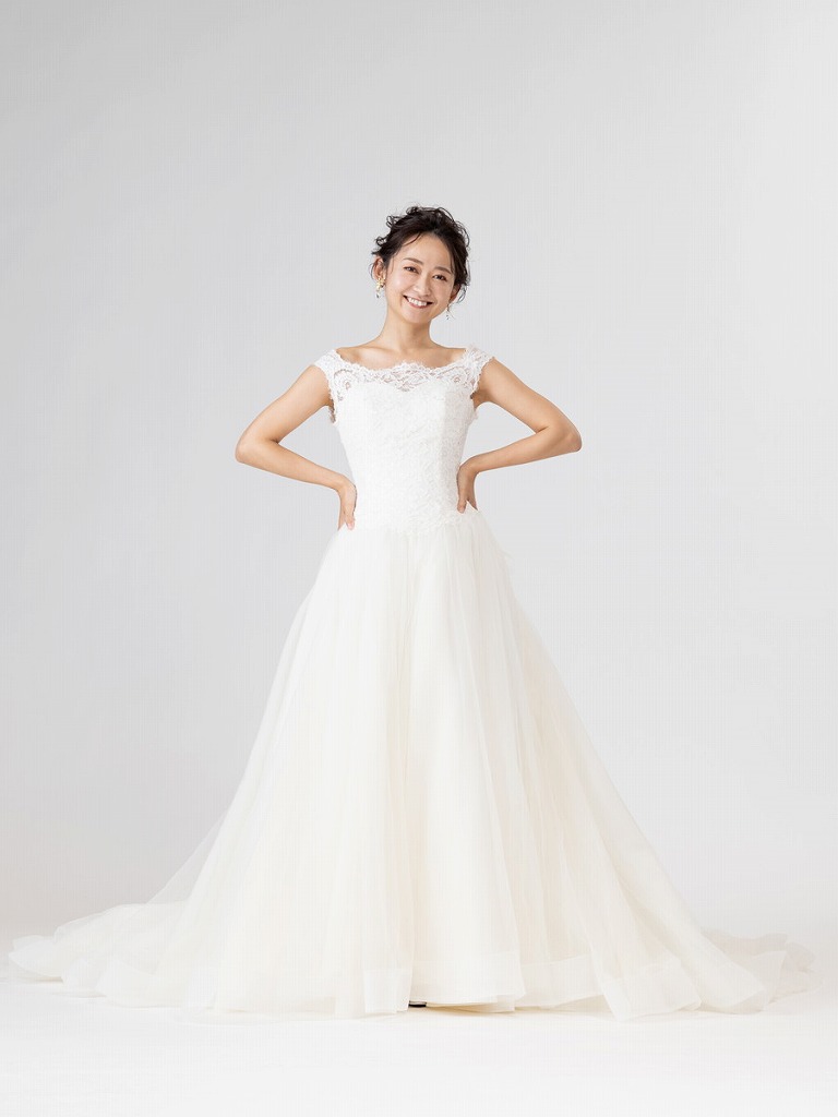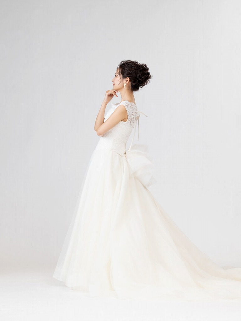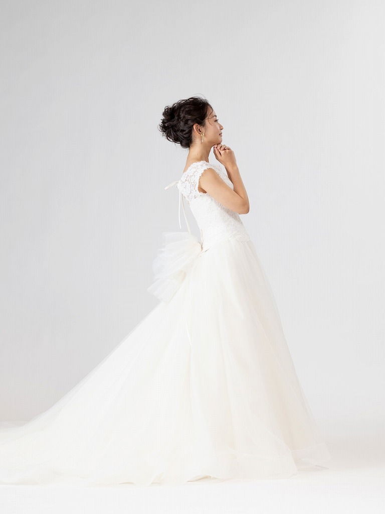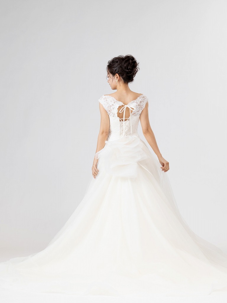 オフショルダーのデザインが上品な印象にさせてくれる1着。背中のリボンが印象的なのでバックスタイルも人気です。