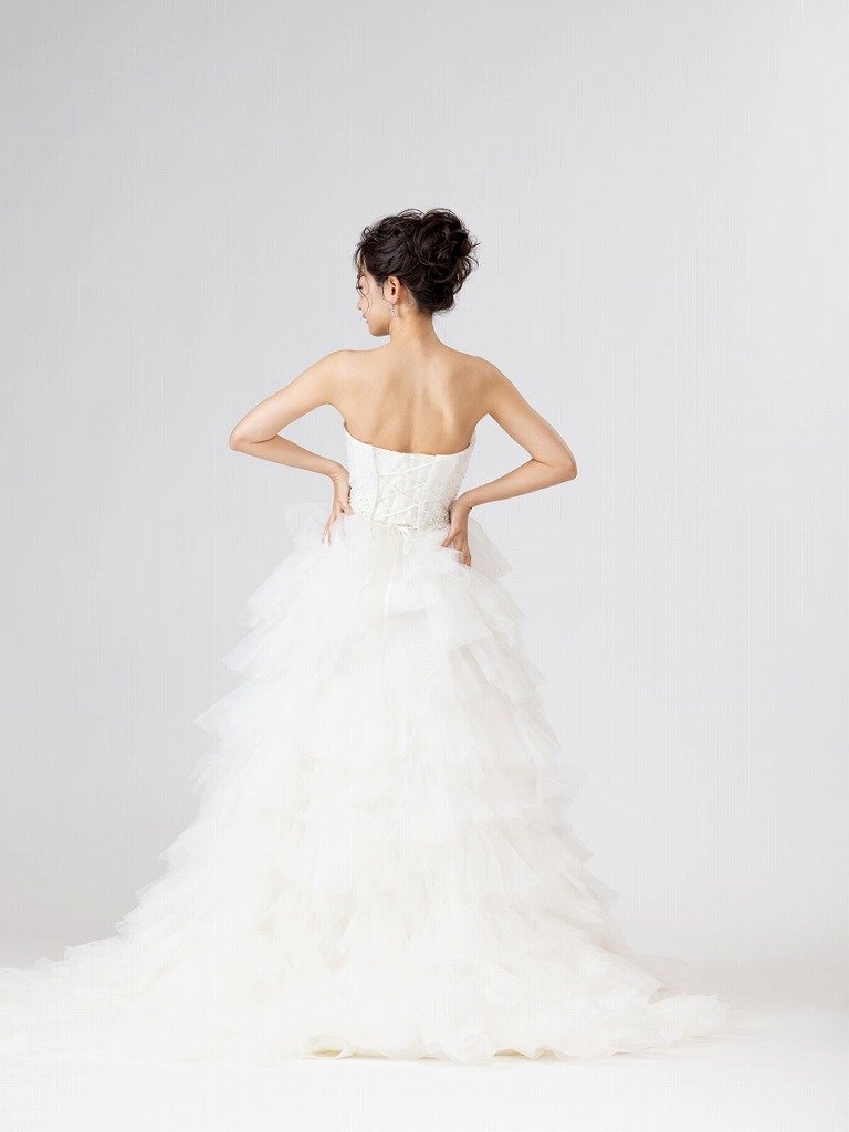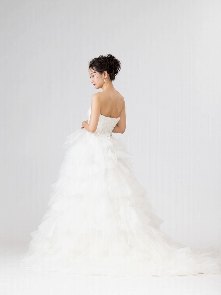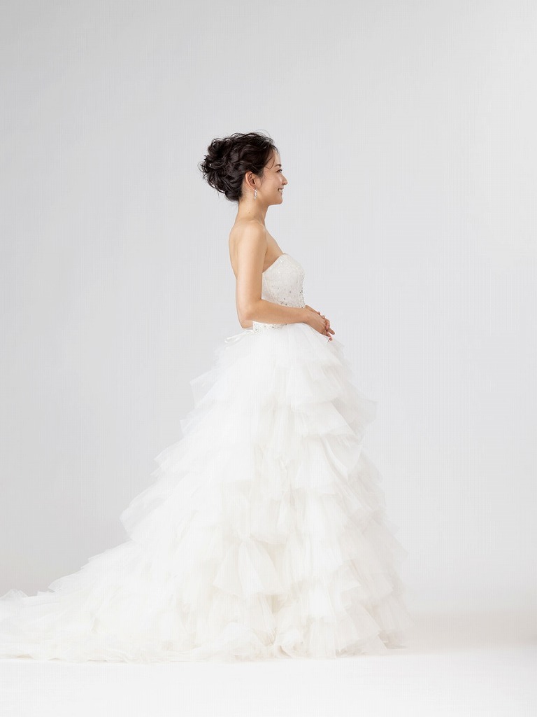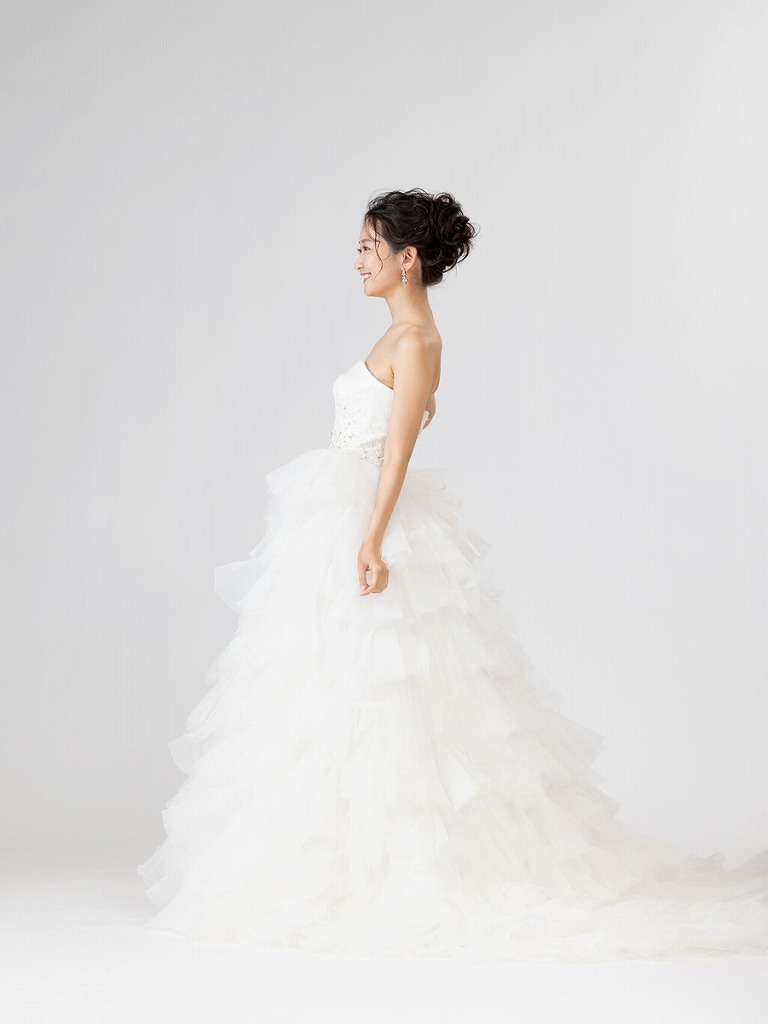 幾層にも段になったチュールは、可愛いだけでなくスタイリッシュな印象にもさせてくれるデザイン。切り返しが高めの位置にあるため、スタイルアップも叶えてくれるドレスです。