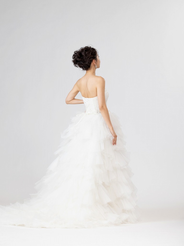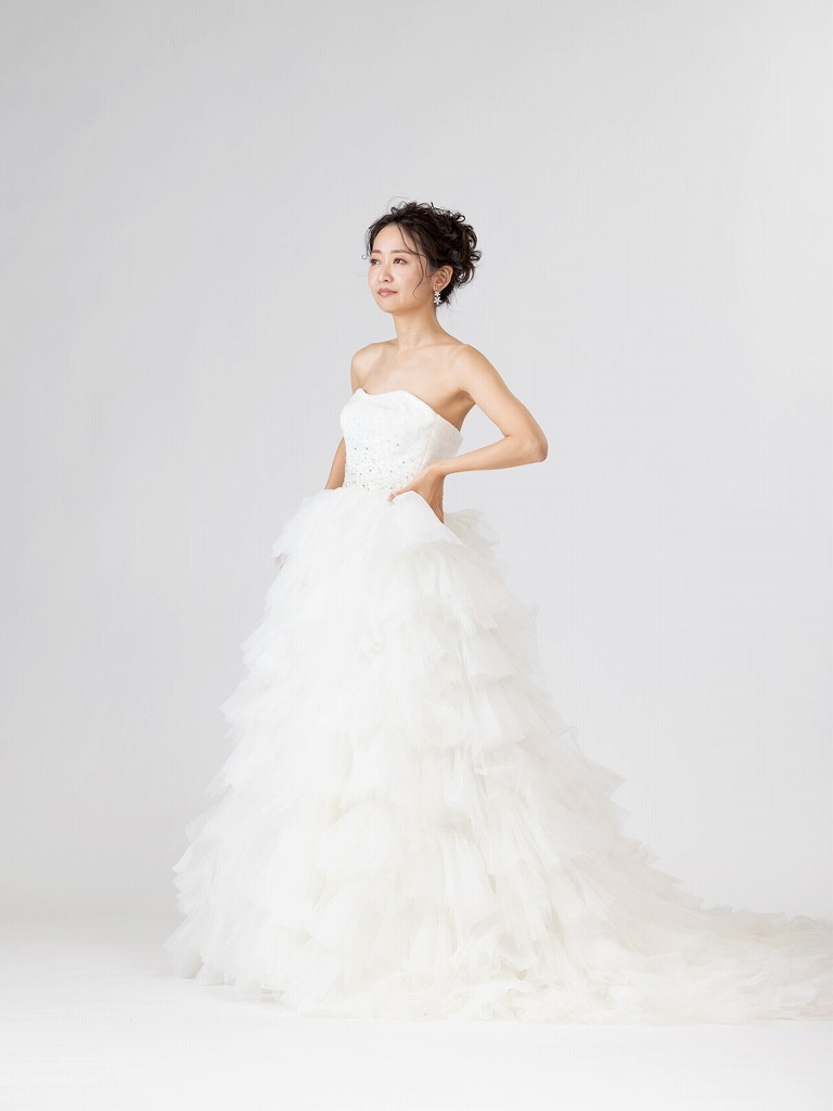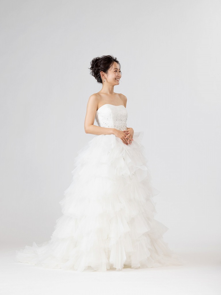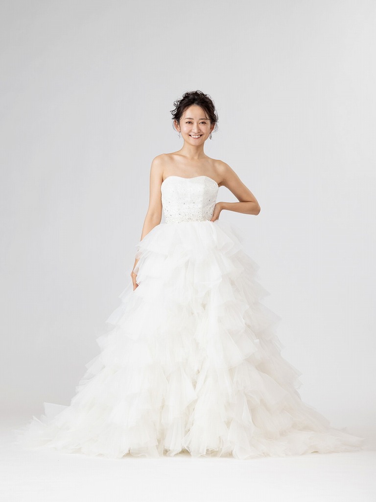 幾層にも段になったチュールは、可愛いだけでなくスタイリッシュな印象にもさせてくれるデザイン。切り返しが高めの位置にあるため、スタイルアップも叶えてくれるドレスです。