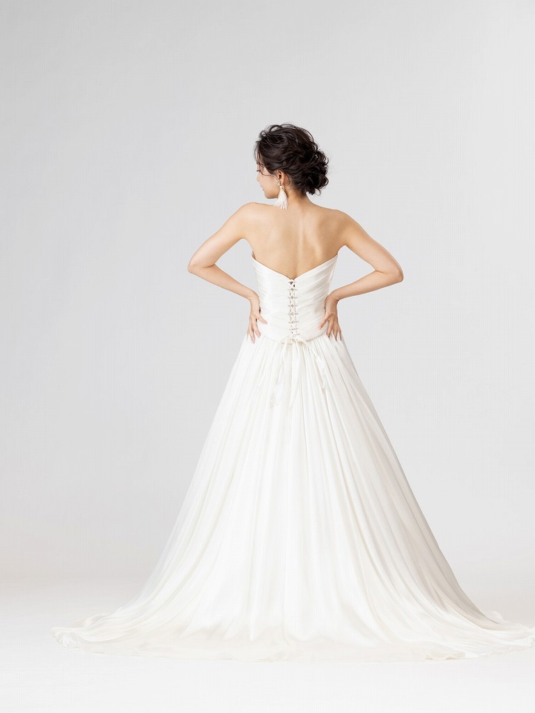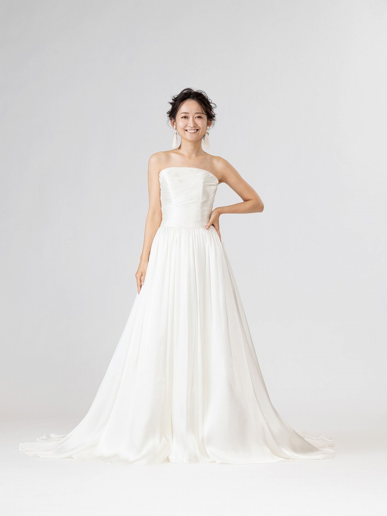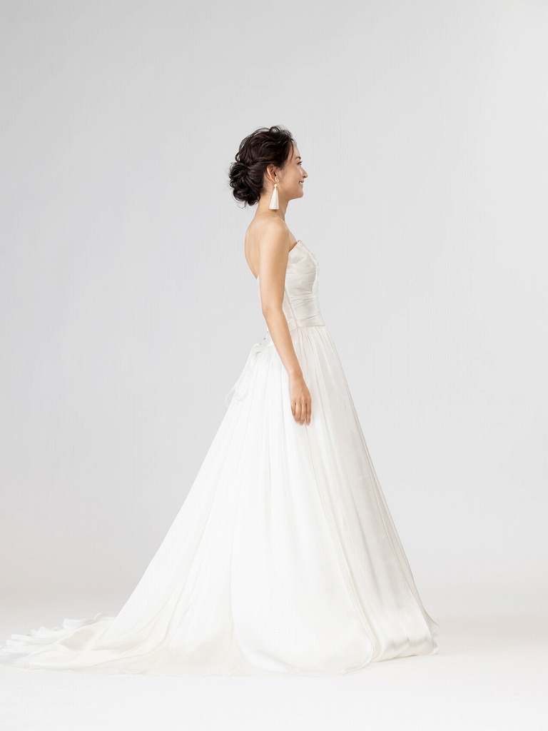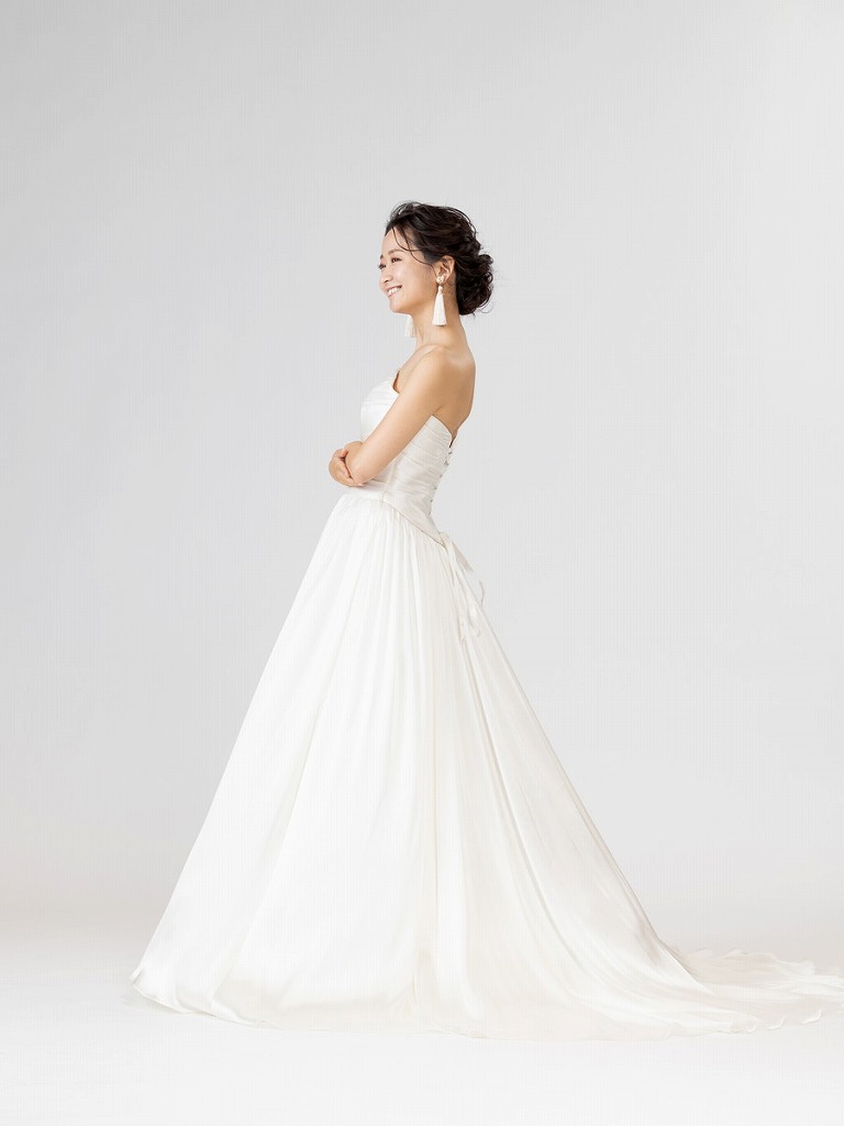 ウエストから裾にかけてのギャザーがよりスタイルアップをさせてくれる1着。