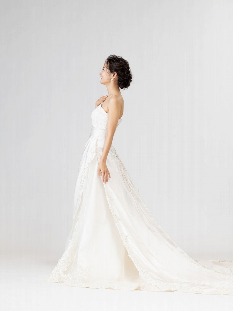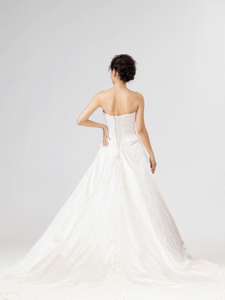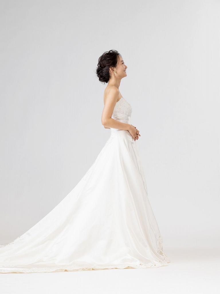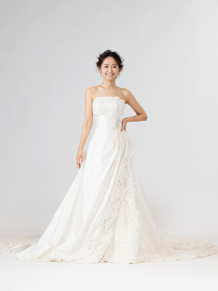 流れるようなデザインのレースが印象的な1着。トレーンにもレース感があるデザインが入っているので、暗めの床の色だとレースが浮かび上がり、より可憐な雰囲気になります。