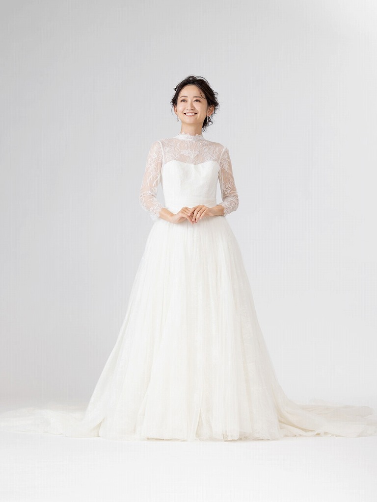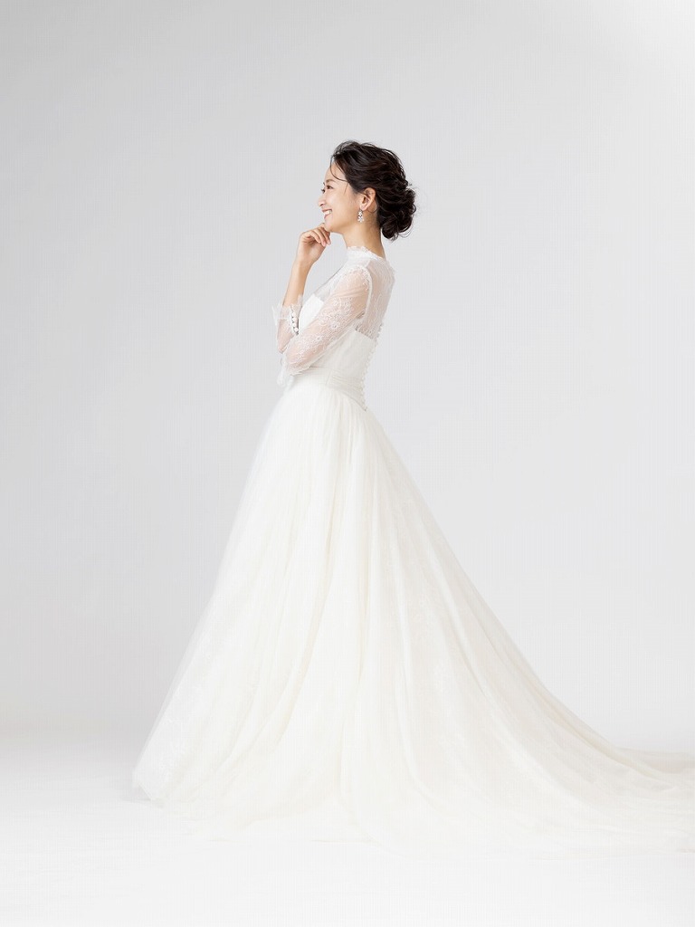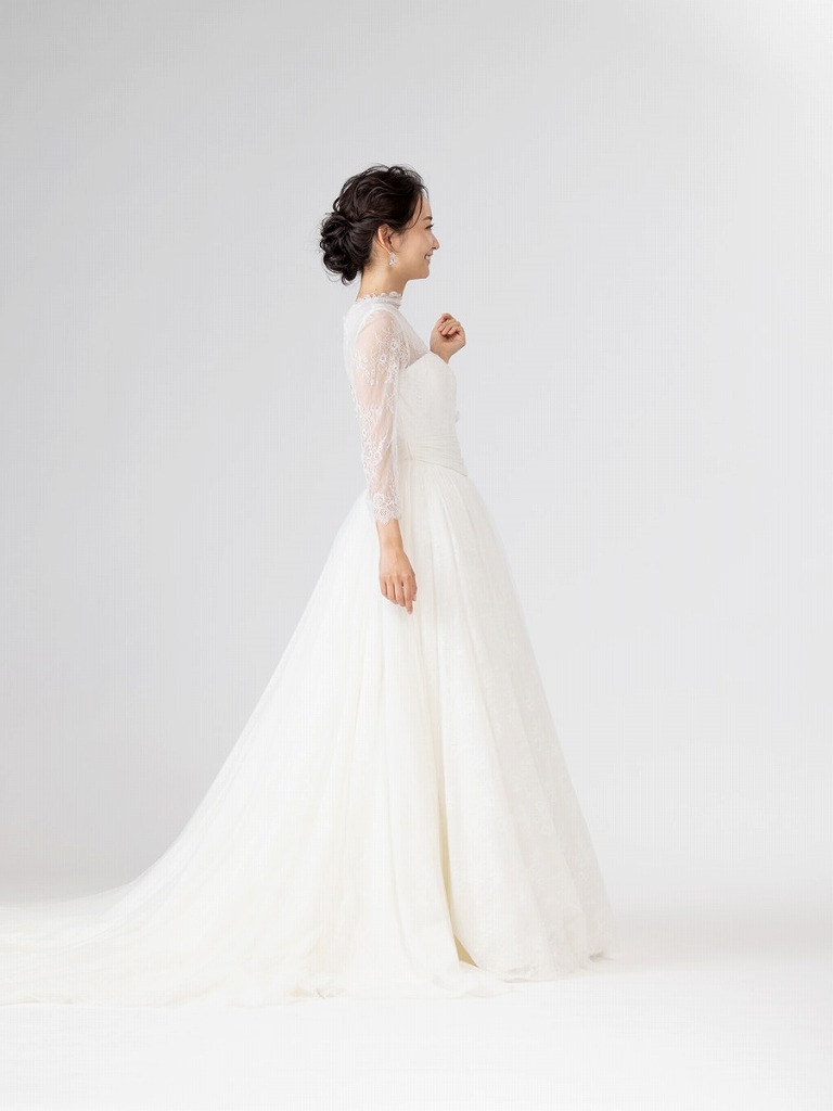 デコルテや腕部分にレースをあしらったクラシカルなスタイルのドレス。お背中側は首筋がしっかり見えるように空いているので、上半身をより華奢に見せてくれるようなデザインです。