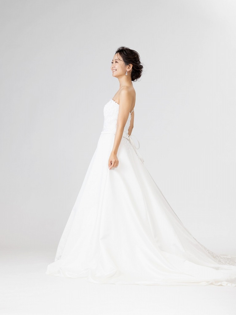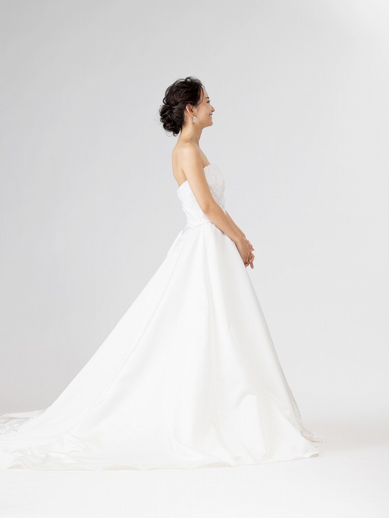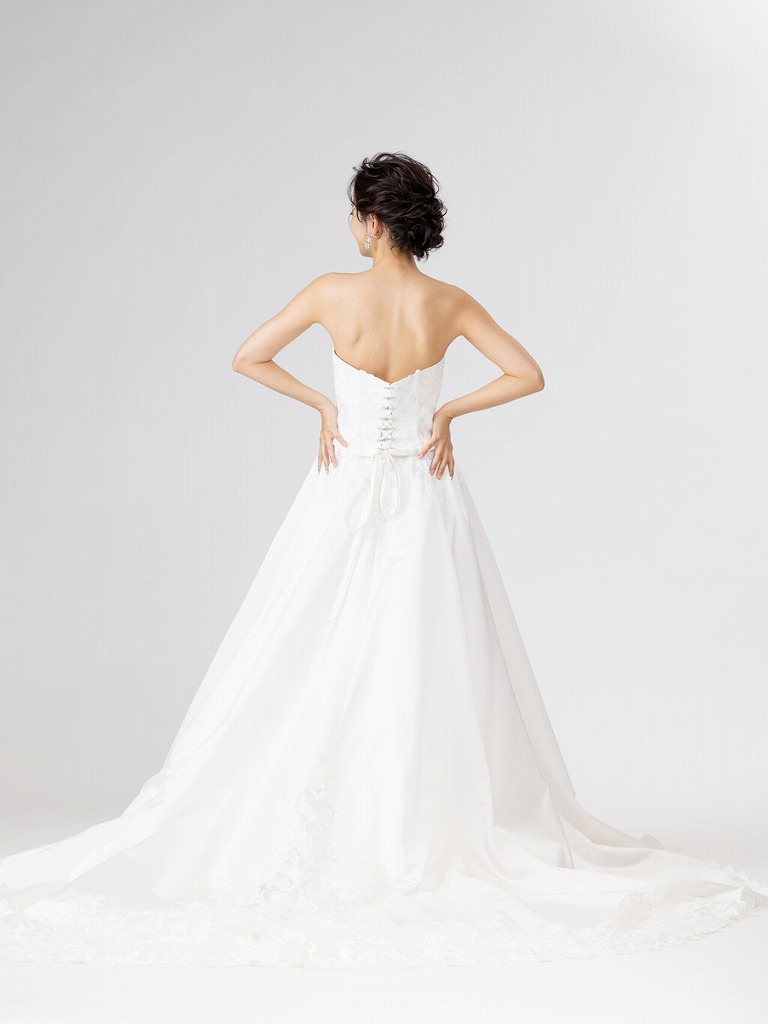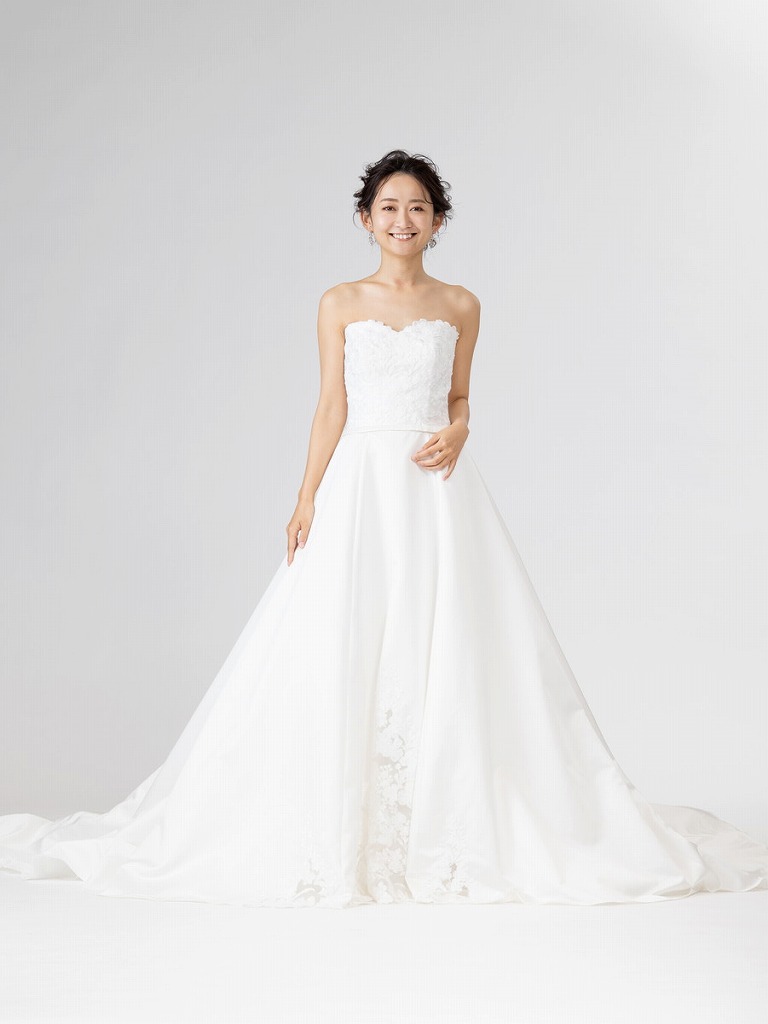 胸元のハートカットがデコルテラインを美しく見せてくれるデザインの1着です。