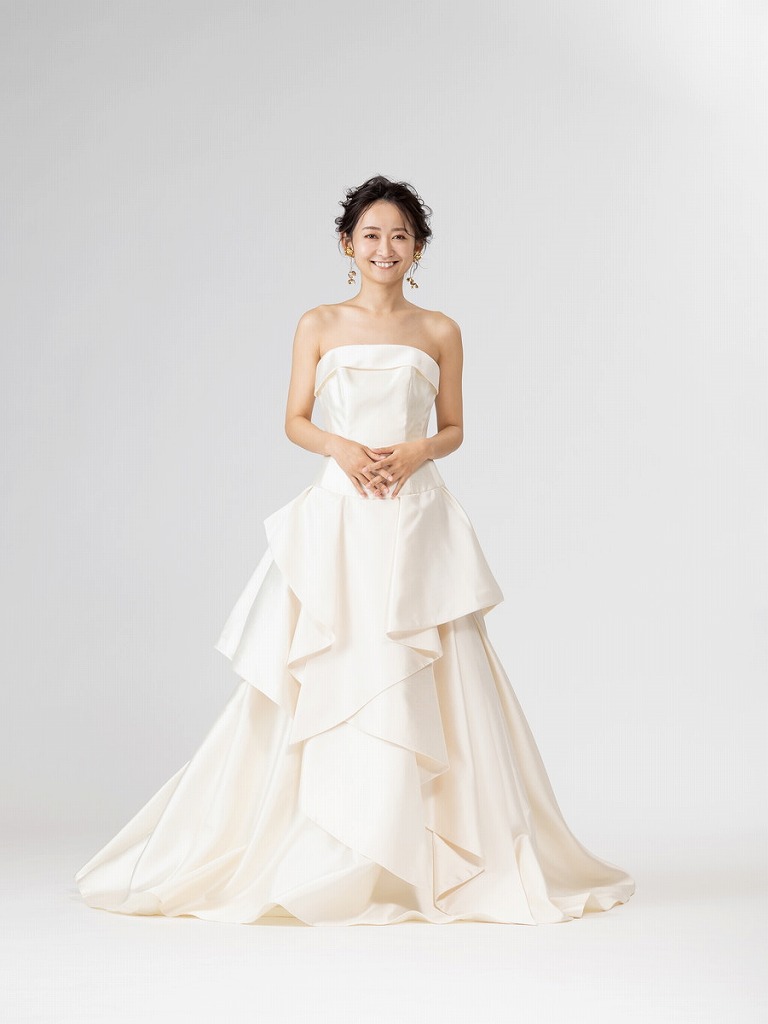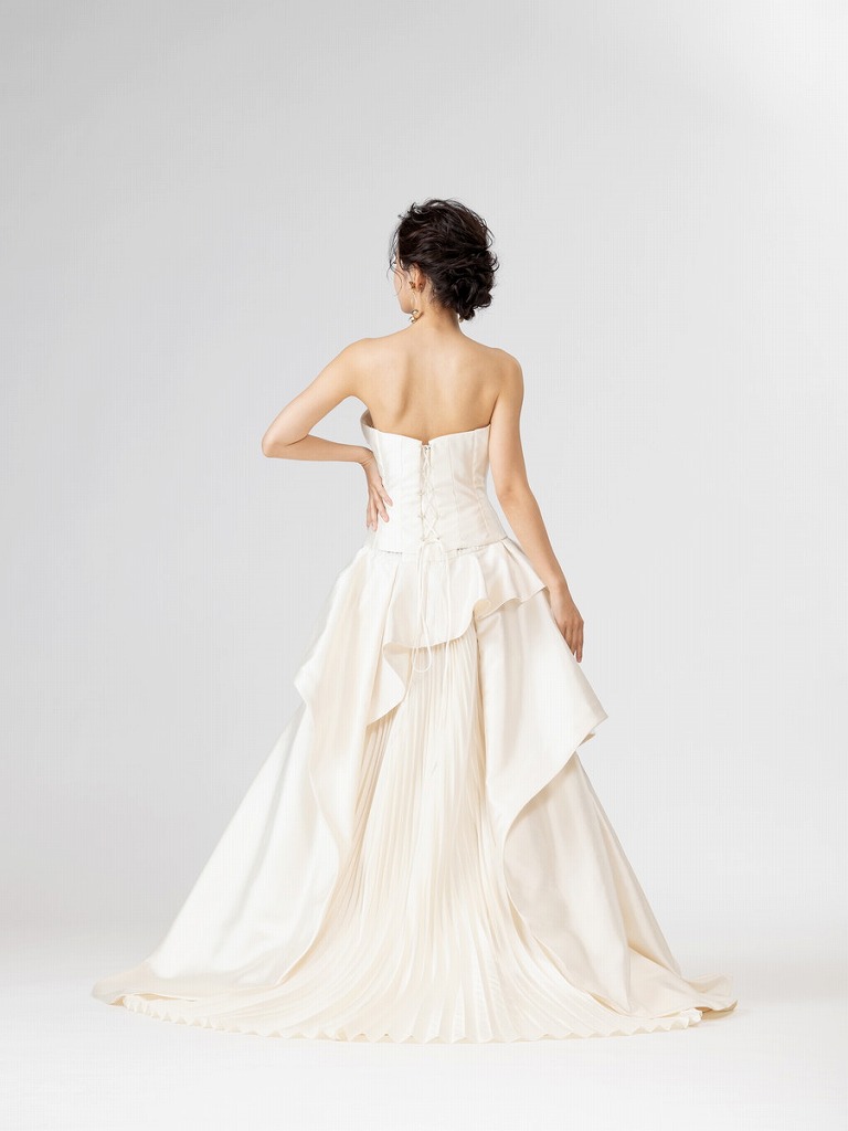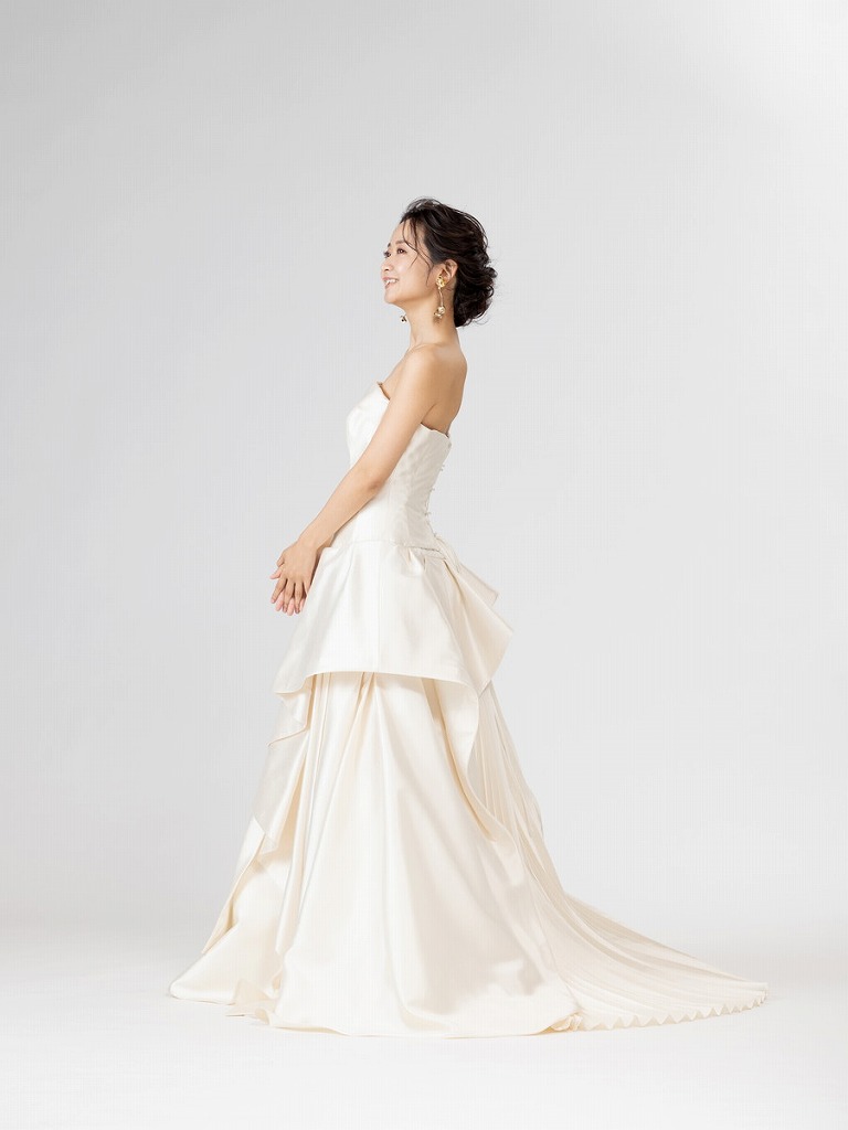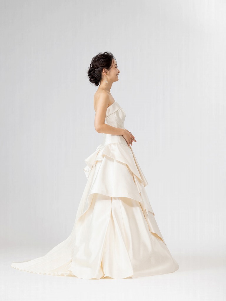 波打つような裾のデザインが印象的な1着。生地感はしっかりとしているのでクラシカルな雰囲気いぴったりなドレスです。