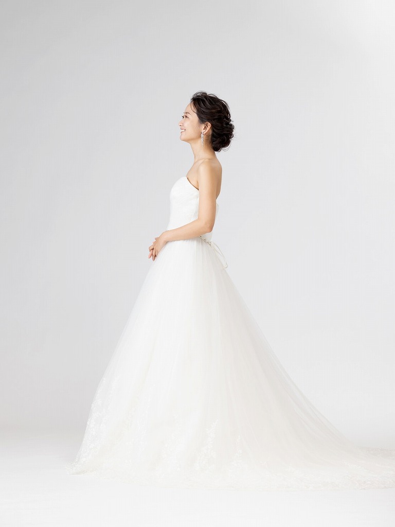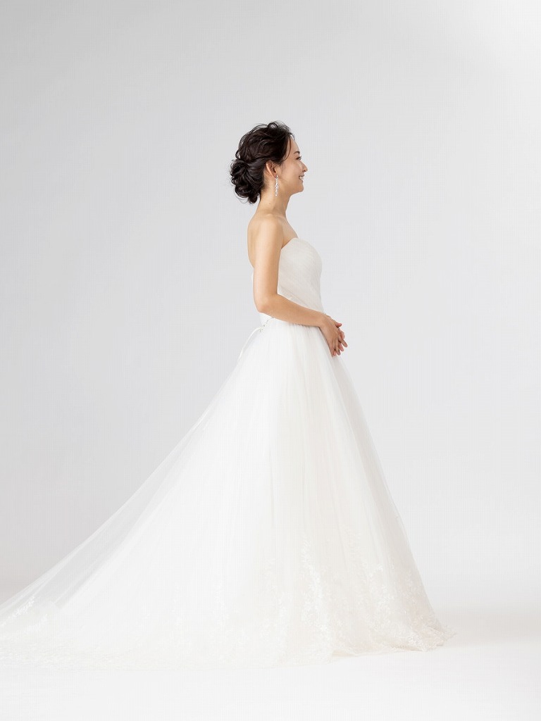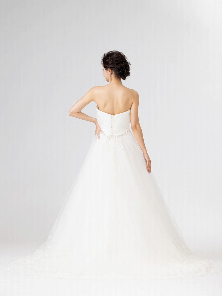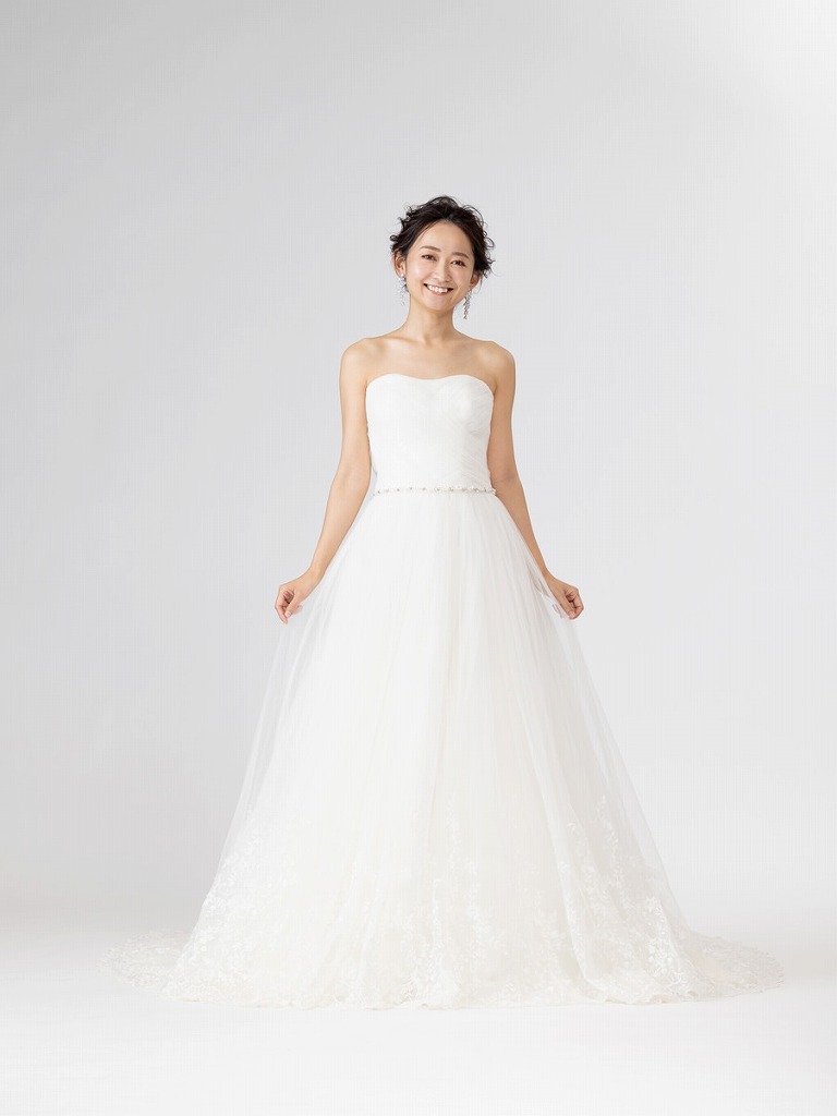 胸元のチュールがクロスしているデザインは、ウエストの細さを強調させてくれます。ウエストマークをしているラインもスタイルを更に良く見せてくれるポイントです。