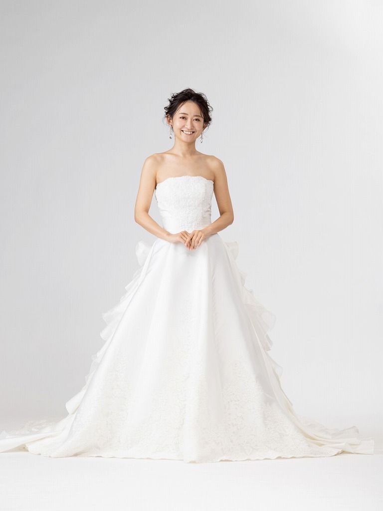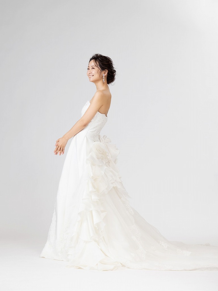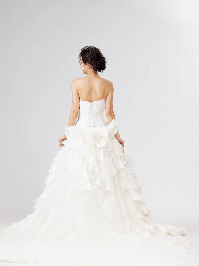 トレーン全体のボリューミーなフリルが優雅なイメージを演出してくれるデザインです。ウエストラインはすっきりとしたデザインなのでスタイルアップも叶えてくれるドレスです。