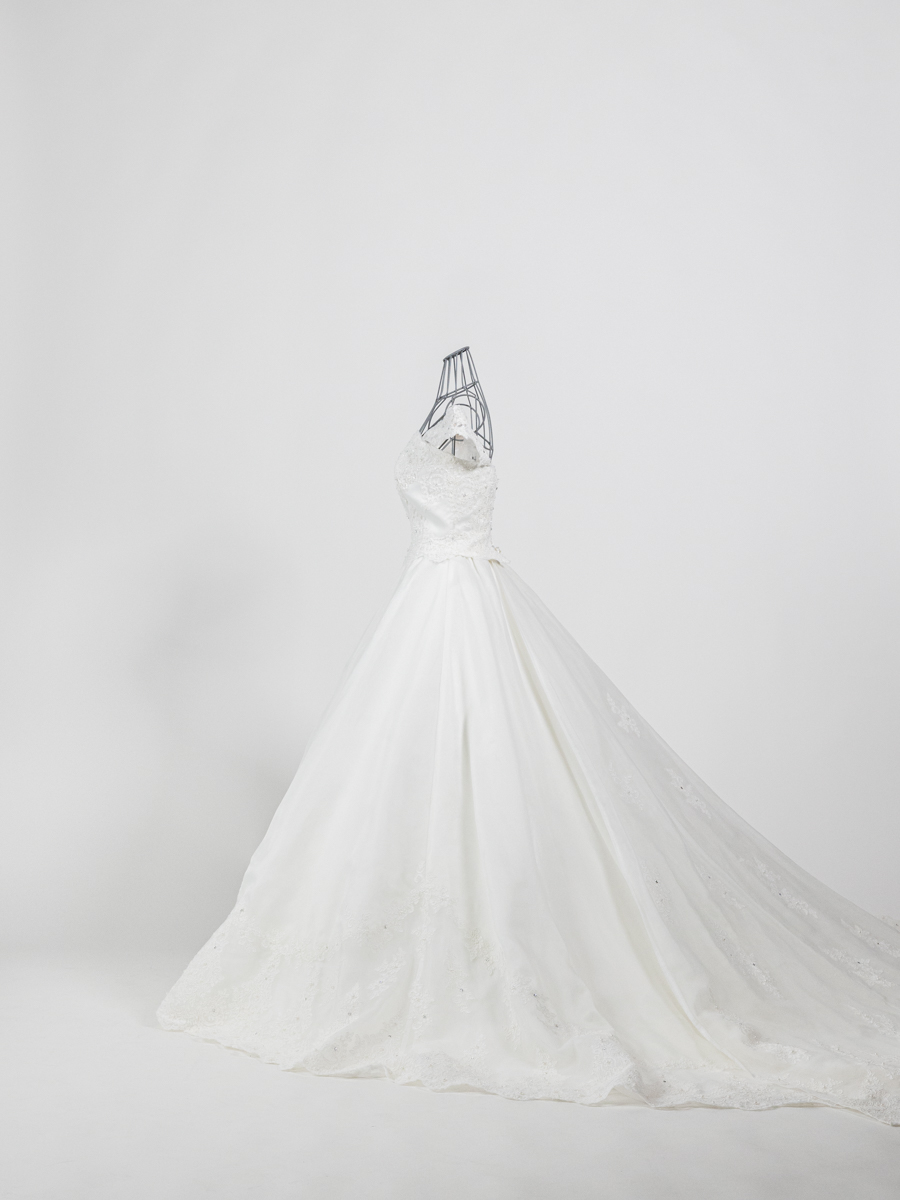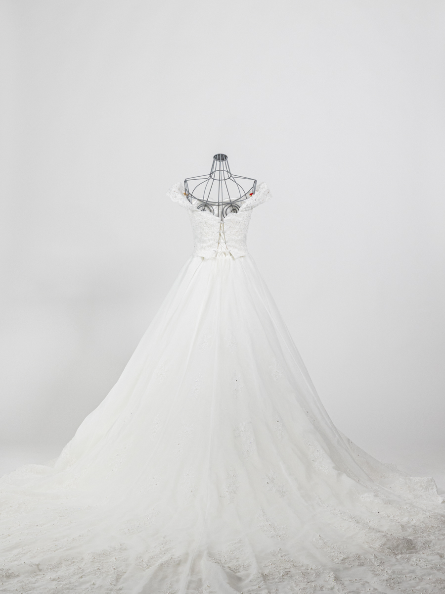 オフショルダーのデザインは可愛らしい雰囲気の中にも上品さを加えてくれます。肩にレースがかかるので、腕周りが気になる方も安心して選んでいただいております。