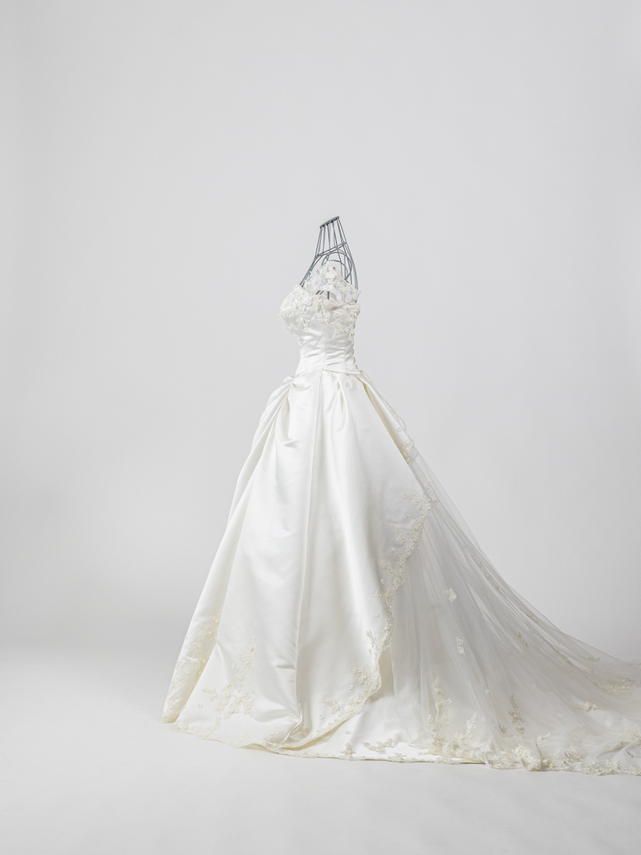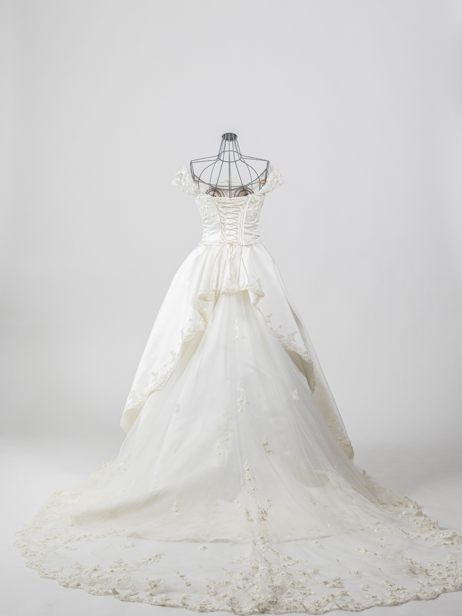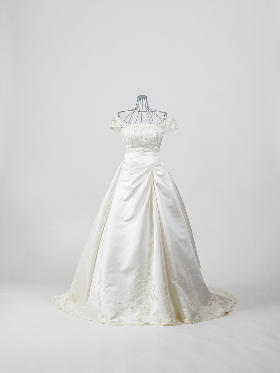 肩にあしらわれた刺繍のデザインがファンシーな印象をだしてくれますが、ドレスライン自体はすっきりとしているので大人可愛いデザインです。