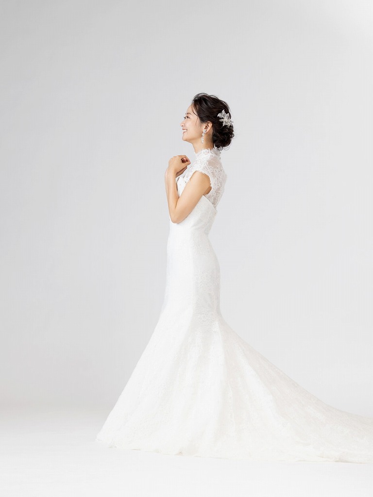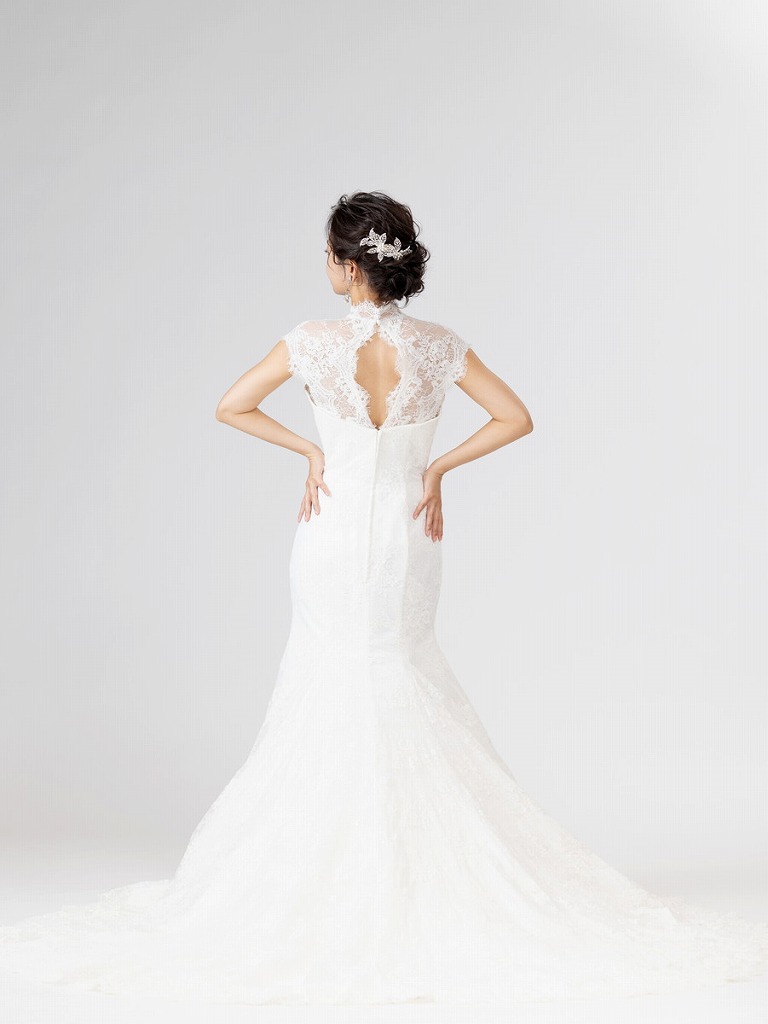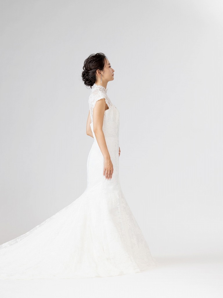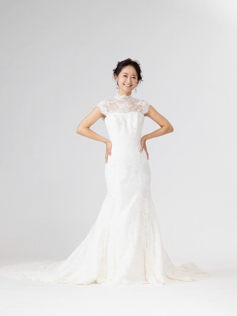 ボディラインを綺麗に見せてくれるしっかりとしたマーメイドラインのドレス。デコルテのレースが上品な印象にさせてくれる1着です。