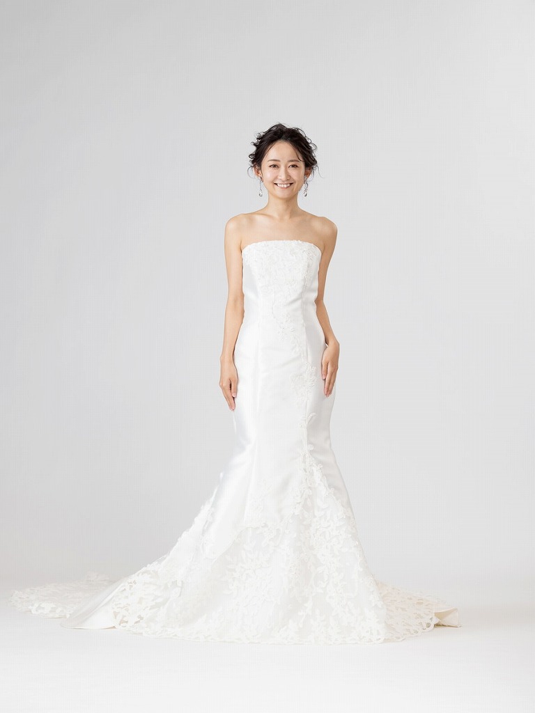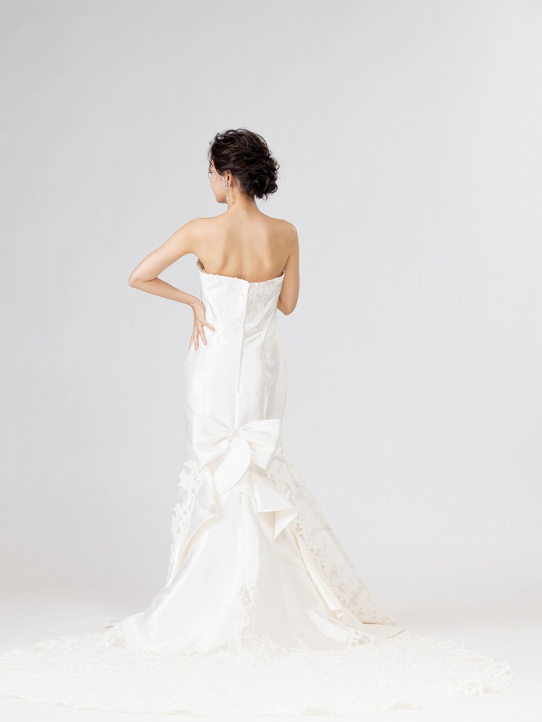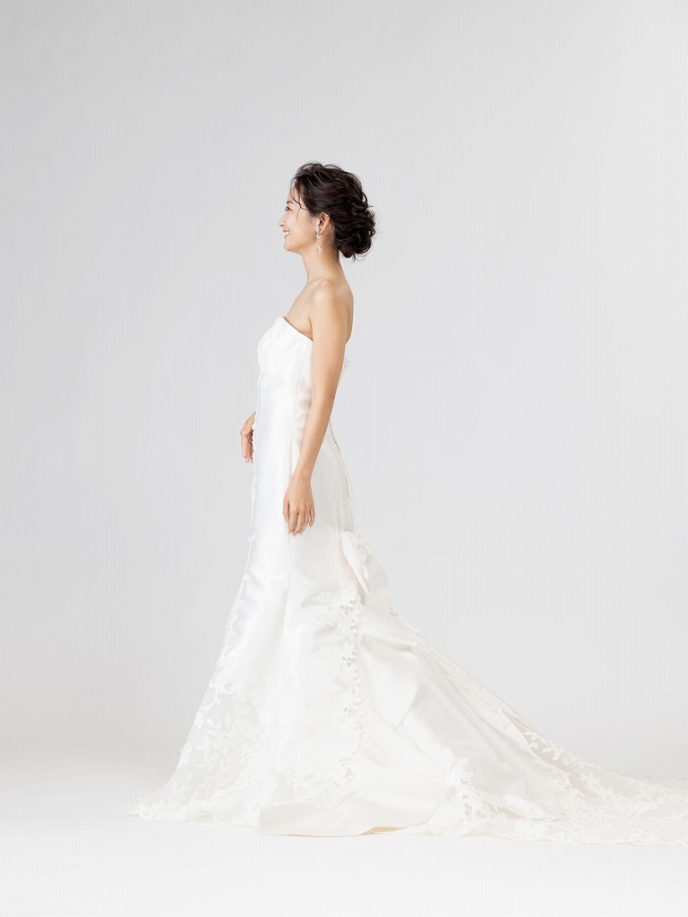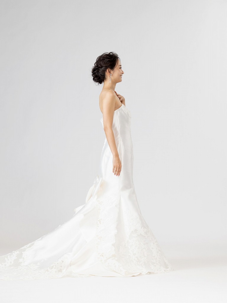 しっかりとした生地感のクラシカルなマーメイドドレス。きっちりとしたアップスタイルで大人っぽくしても、ふわっとしたスタイルで抜け感出してをもエレガントになる1着です。