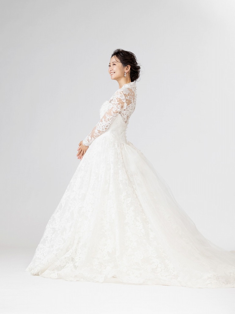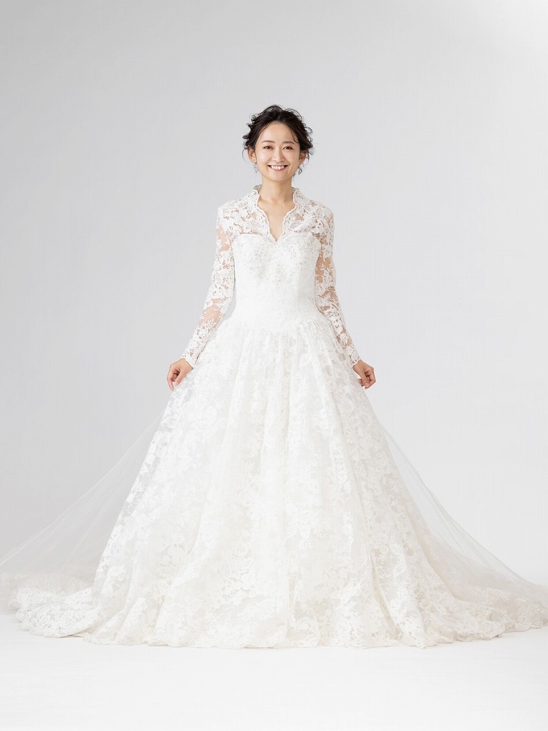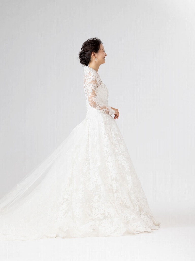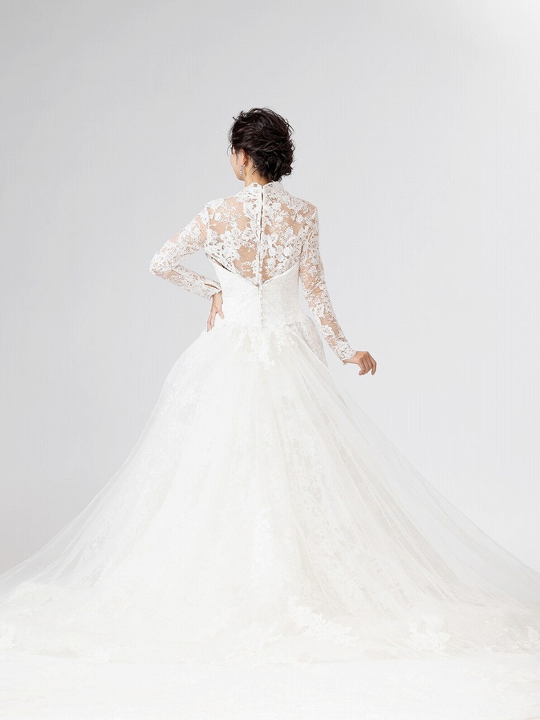 様々な大きさの刺繍をもちいたデザイン。首元に立ち上がるような刺繍デザインはクラシカルなイメージを叶えてくれます。