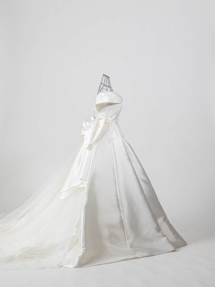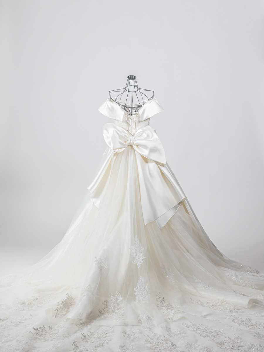 幅広のオフショルダーはプリンセスのような可憐な印象にしてくれます。生地感がしっかりとしているので重厚感がありクラシカルなイメージも演出してる1着。