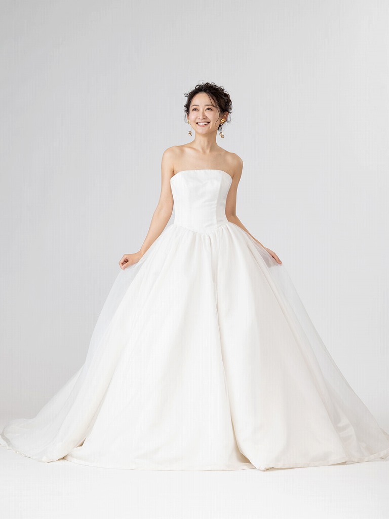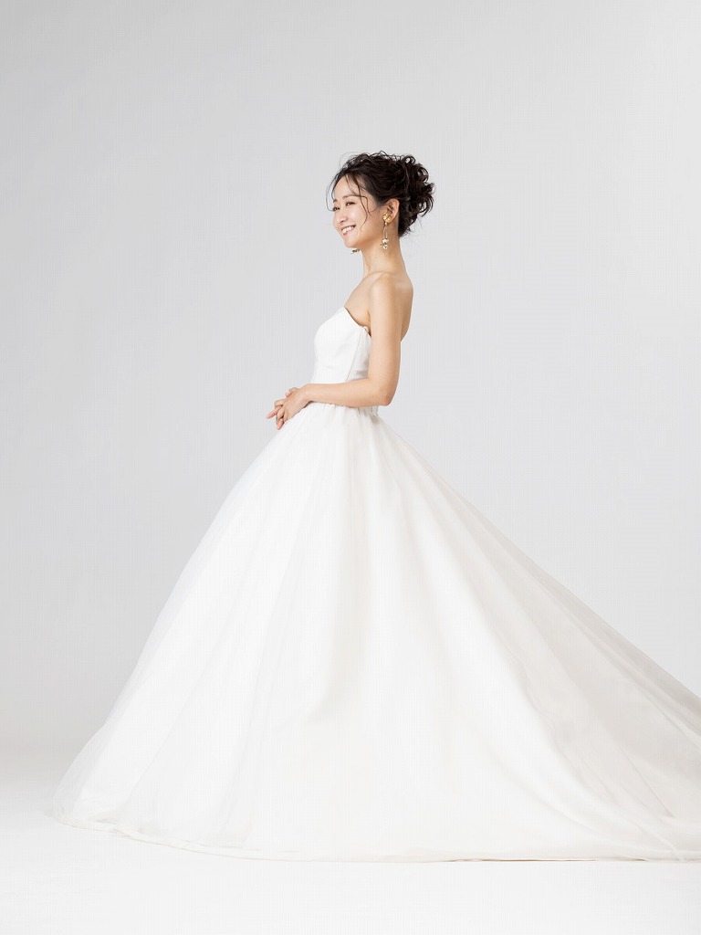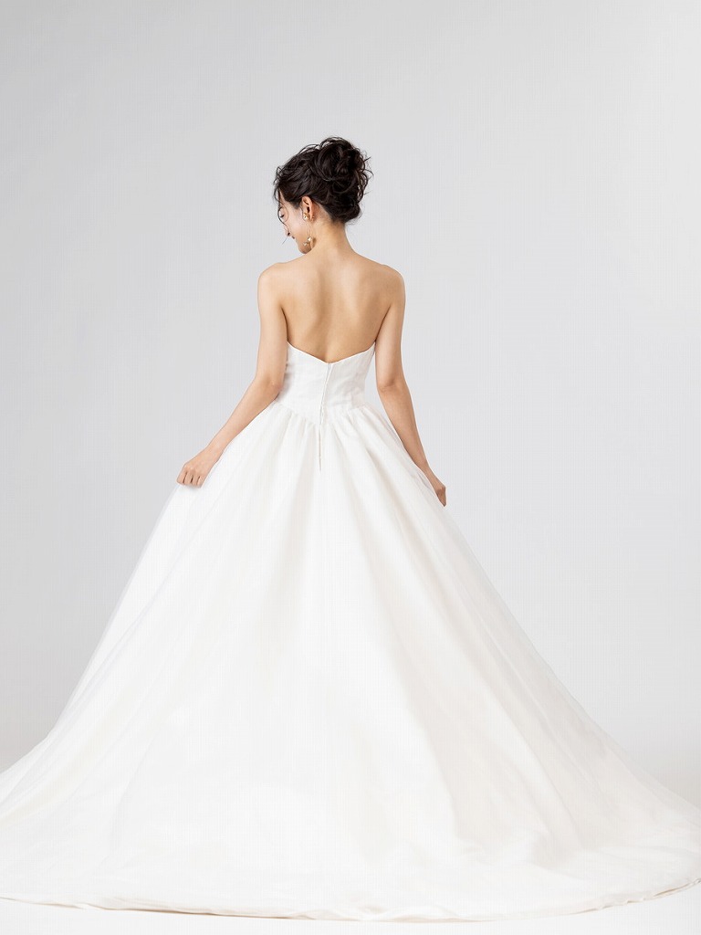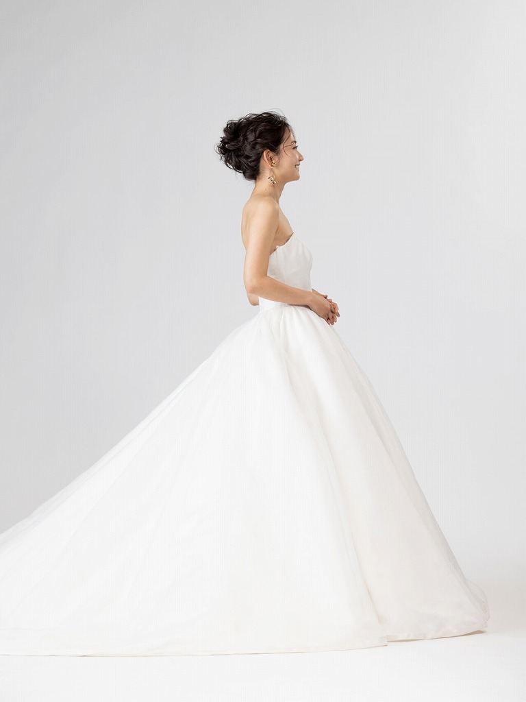 サテン生地の上にオーガンジーをあしらったデザイン。しっかりとしたクラシカルな印象の中にも軽やかな生地を使用してナチュラルな雰囲気も演出してくれるドレス。