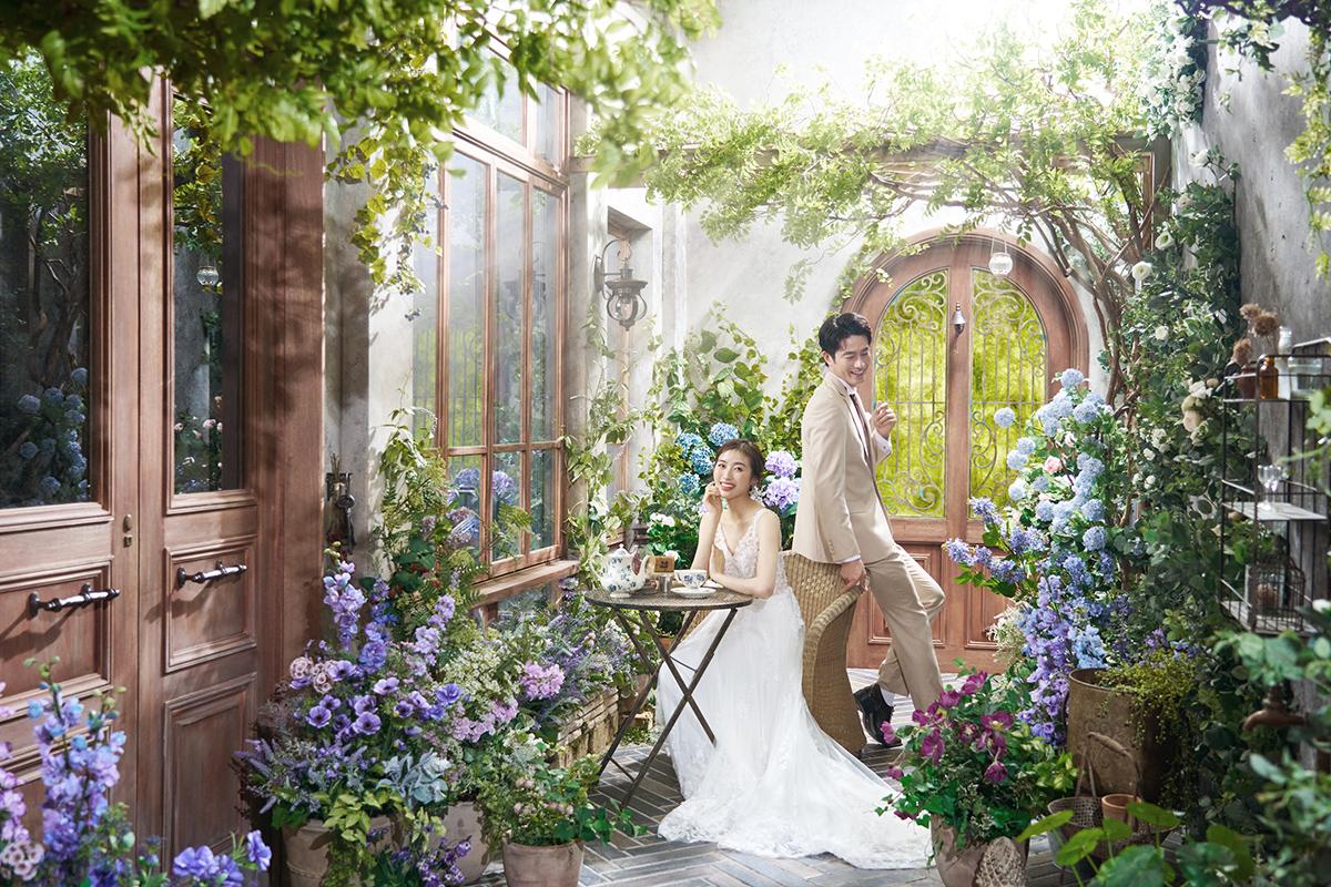 可憐な花々に囲まれた、春の中庭をイメージしたセット。