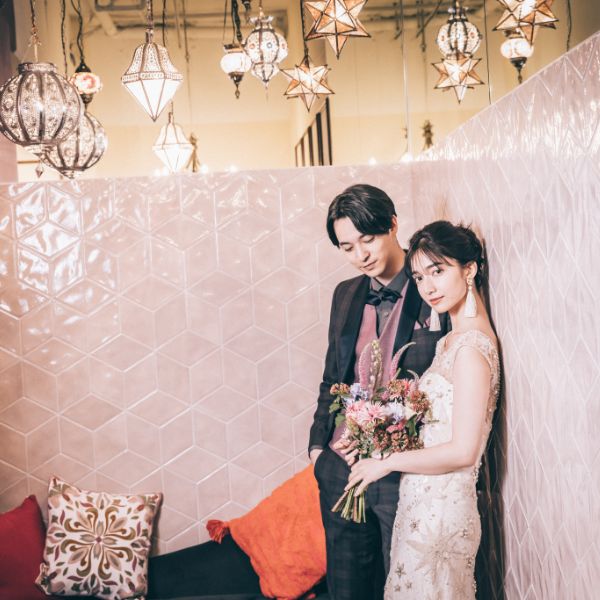 ピンクのタイルやモロッコランプがロマンティックに2人を包み込む。