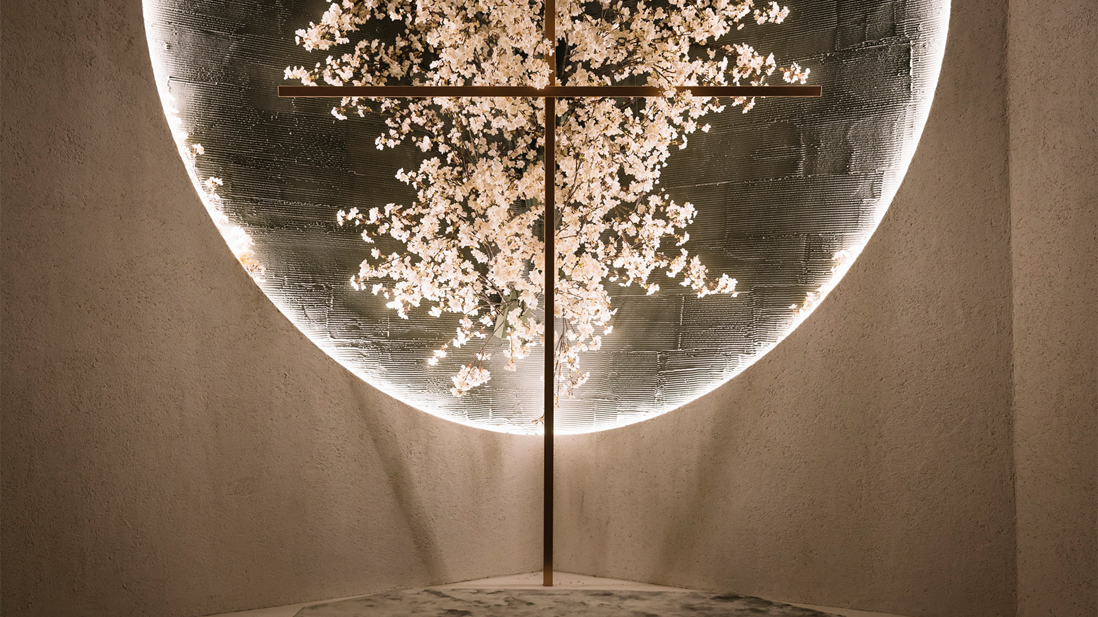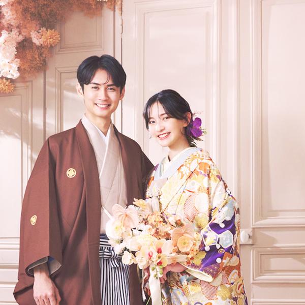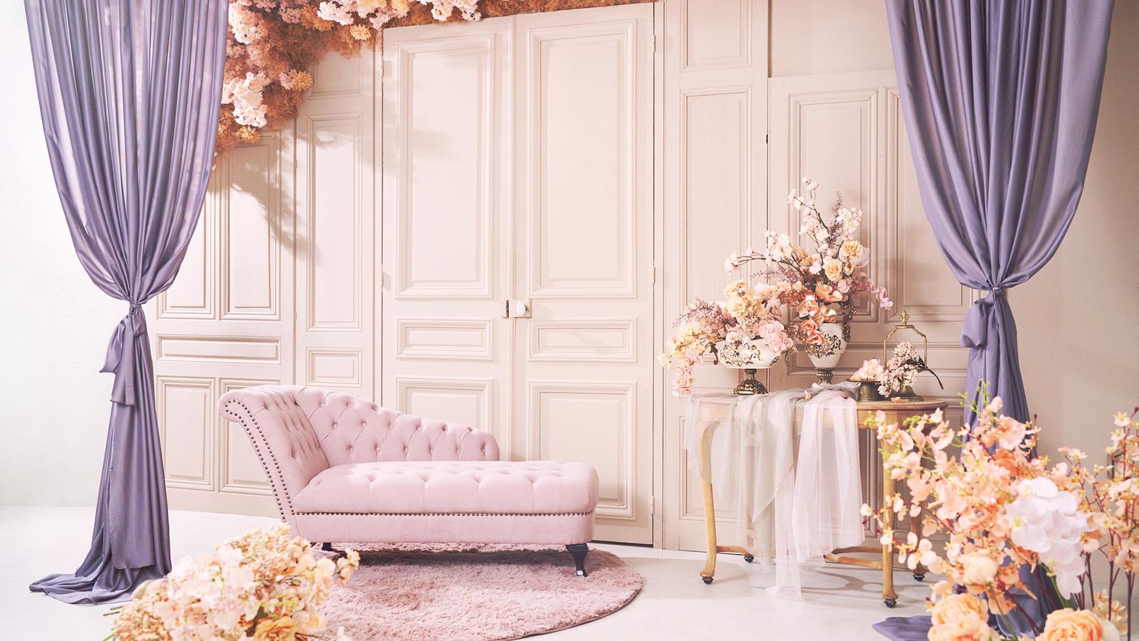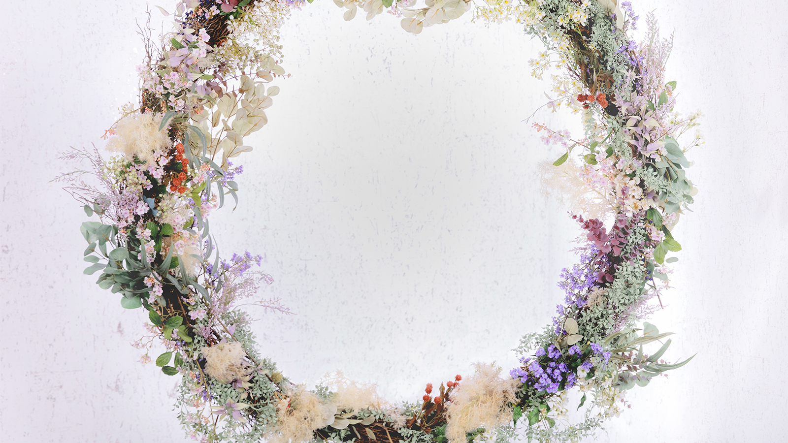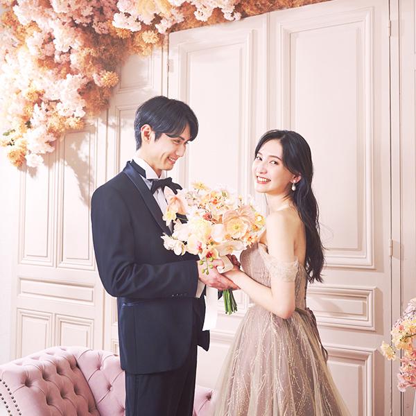 海外で洗練されたアンティークの大扉を溢れるほどの花ばな(桜/ダリア/カスミソウ)が華やかに覆う。 「純潔」や「幸福」「永遠の愛」などおふたりの結婚にふさわしい意味のお花に見守られて開く扉のむこうには、 おふたりを幸せな未来へと導く道が続く。