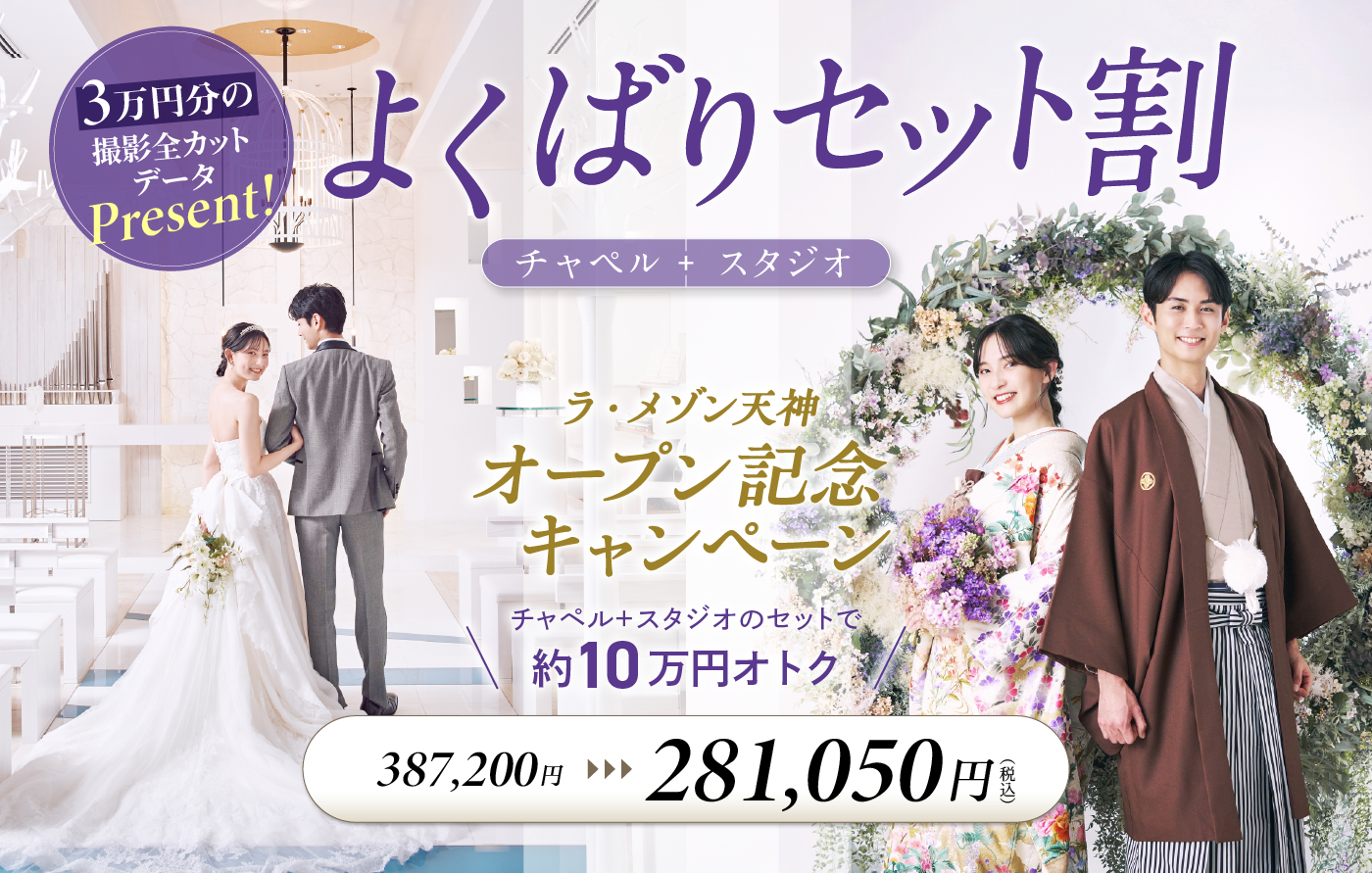 涼しく快適なスタジオと、格式高いホテルのチャペルや神殿の両方で撮影ができる大人気プランが期間限定で10万円~最大約22万円の割引き&プレゼントがもらえるお得なキャンペーンを開催中です。