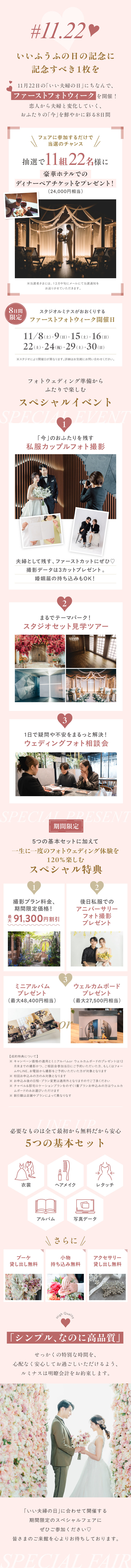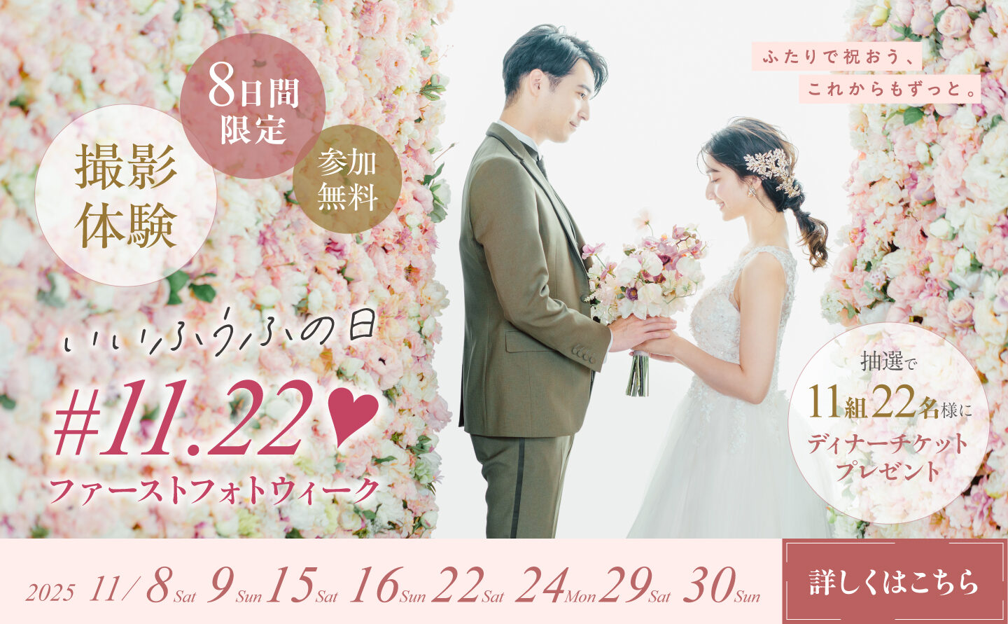 スタジオルミナスでは、関東3店舗で11月22日の「いい夫婦の日」にちなんで、ファーストフォトウィークを開催!恋人から夫婦と変化していく、おふたりの「今」を写真に残してみませんか。さらに、期間中にご来館いただくことで、抽選で11組22名さまに豪華ディナーチケットプレゼント。いい夫婦の日の記念に、おふたりだけの時をゆっくりとお過ごしくださいませ。