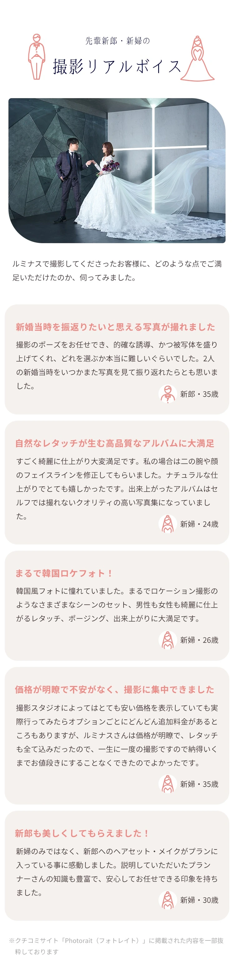 当社撮影後アンケートに寄せられたコメントやクチコミサイト「フォトレイト」に掲載された内容を一部抜粋しております