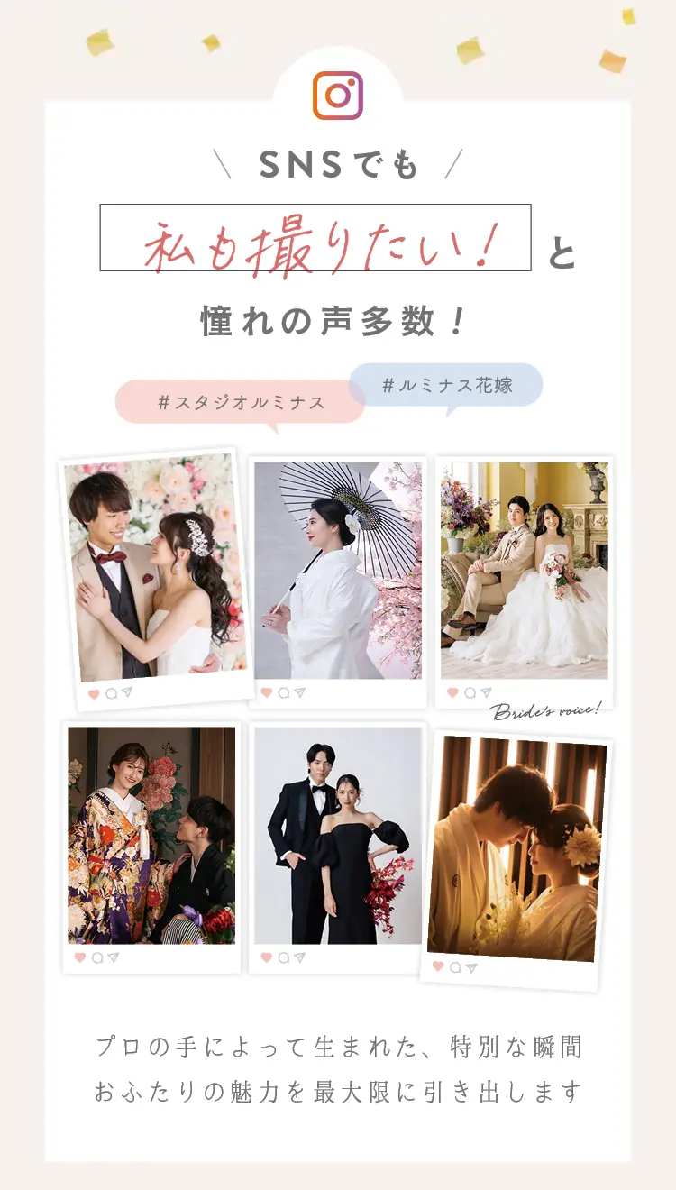 25種類のシーンは、全国のルミナスの人気シーンから作られた選りすぐり。様々な表情を見せるスタジオで花嫁体験を誰よりも楽しんで。