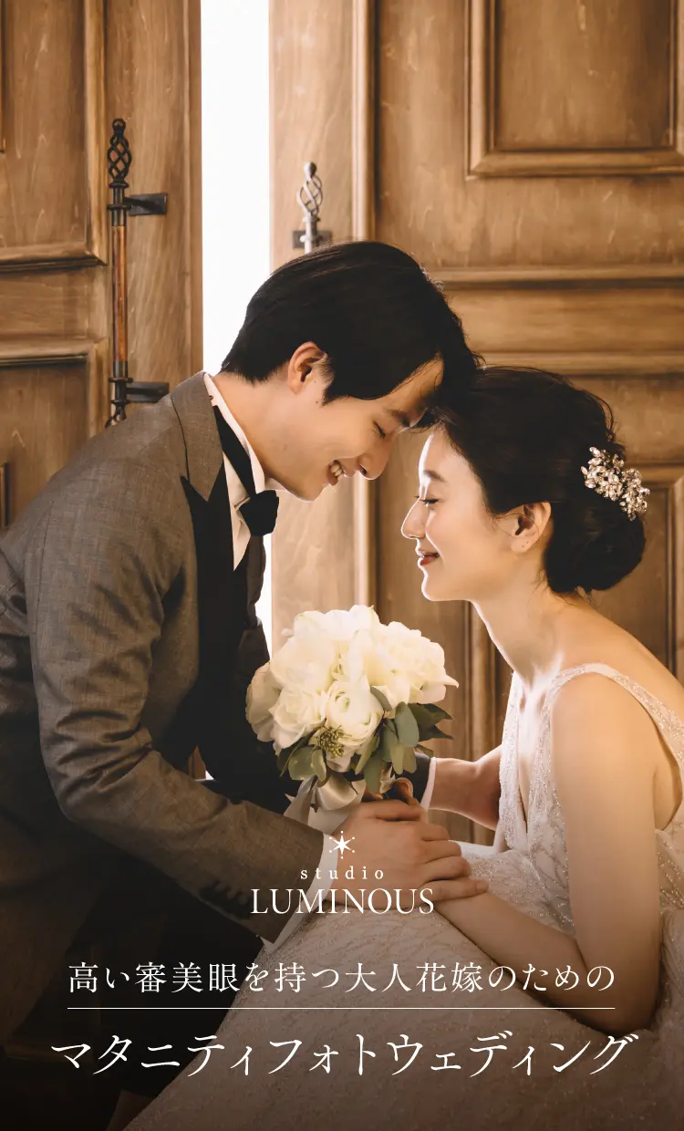 「お腹を目立たせたくない」「肌荒れが気になる」「自分らしく写りたい」そんな妊娠中の花嫁の声に応える、ルミナスこだわりのフォトレタッチ。体の変化を自然に整えながら、“花嫁としての私”を美しく残します。