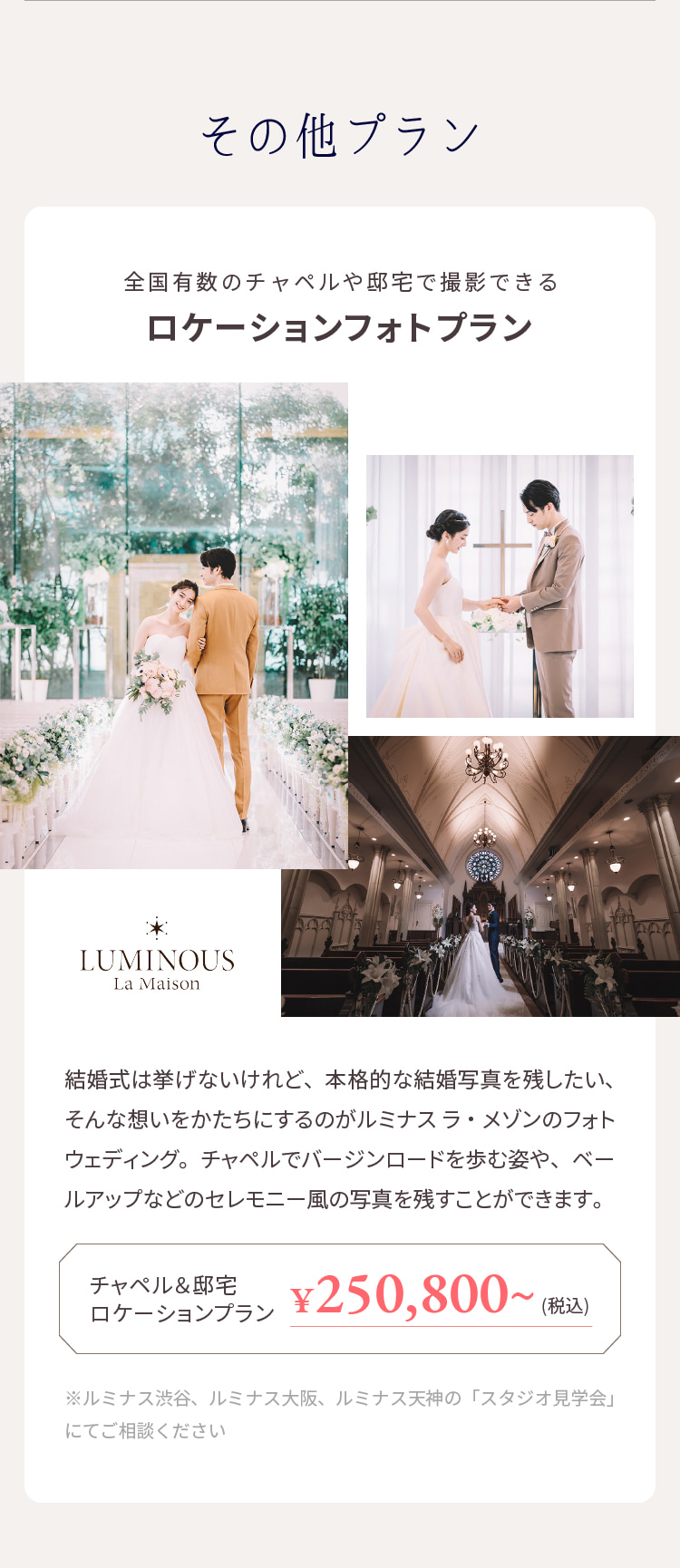 ルミナス銀座、ルミナス大阪、ルミナス名古屋、ルミナス天神の洋装スタジオプランは対象外です