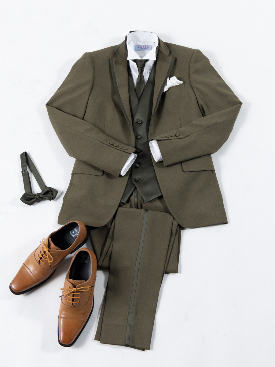 人気のアースカラー、カーキグリーンのタキシードです。 パイピングが施されたラペルが特徴のジャケットをはじめ、スタイリッシュで細身のデザインはトレンドに敏感な新郎様にオススメです。 ボリュームレスのスレンダー系のウェディングドレスとの相性も良く、洗練されたウェディングスタイルに仕上がります。