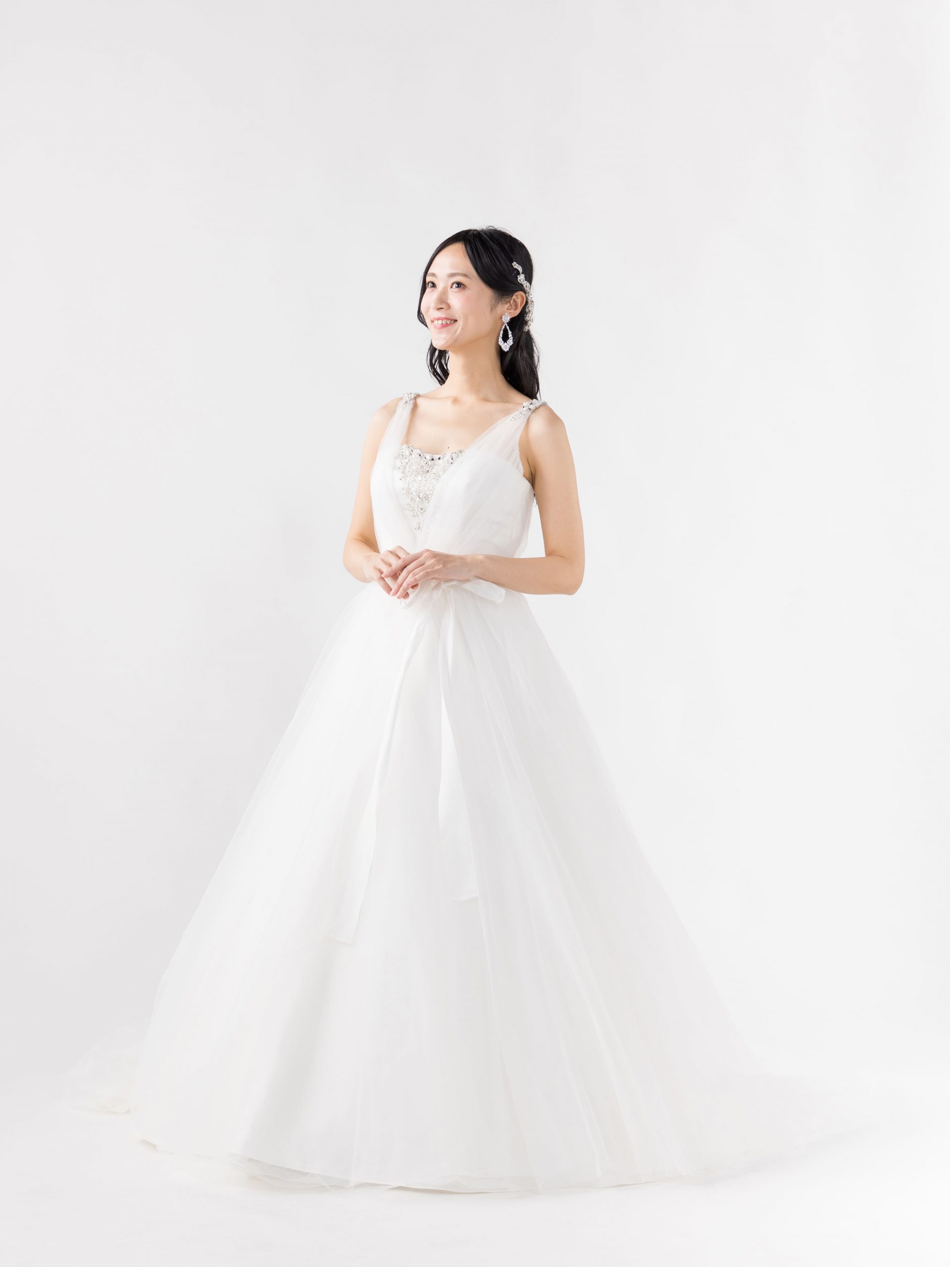 細めのキャミソール部分が華奢で可憐なデコルテラインを演出。胸元から覗く華やかなビジューがお顔色を明るく見せてくれます。洗練されたデザインで、シンプルな中にもしっかりとこだわりが詰まった1着ですので、花嫁様の魅力を存分に引き出してくれます。