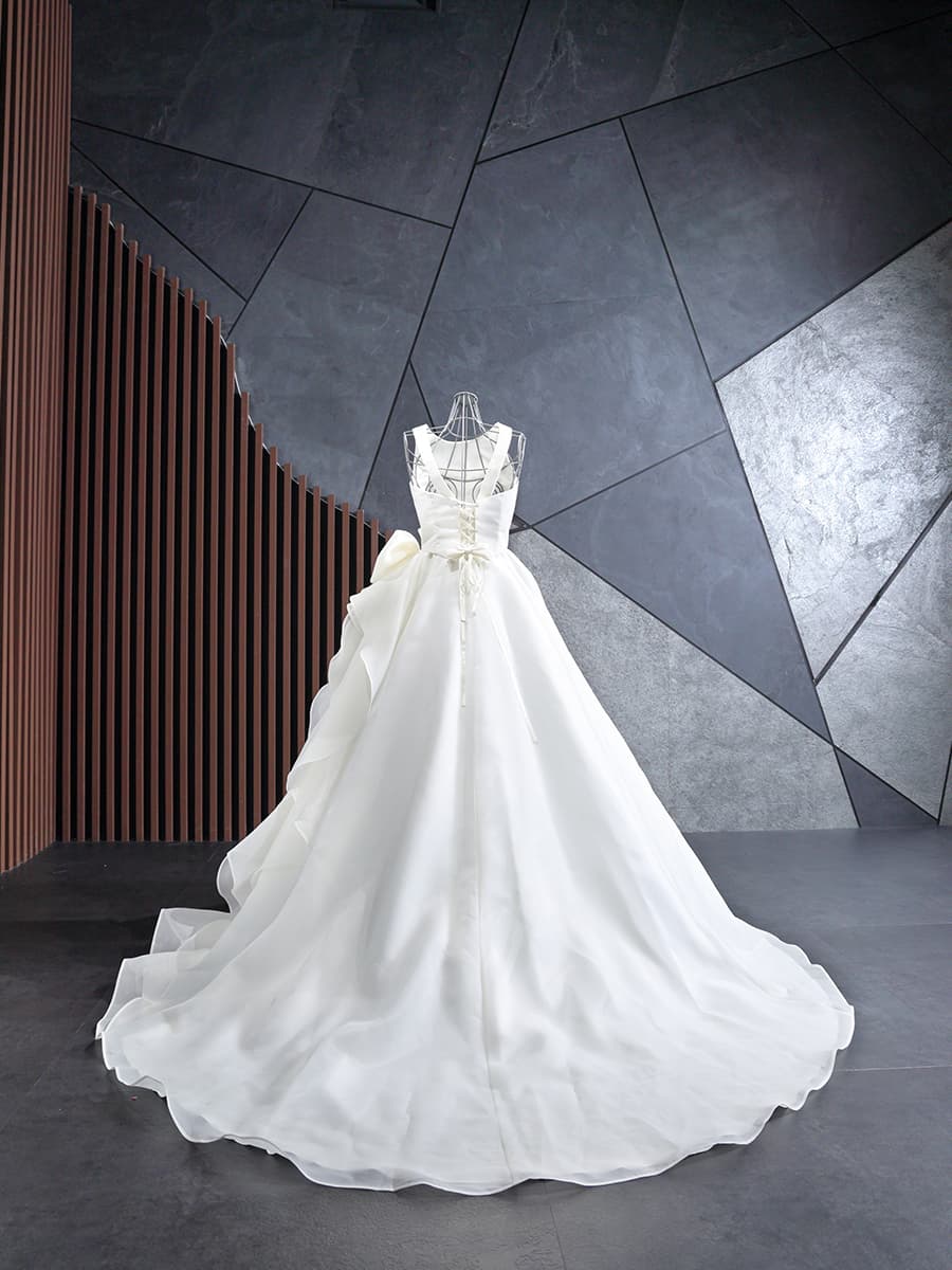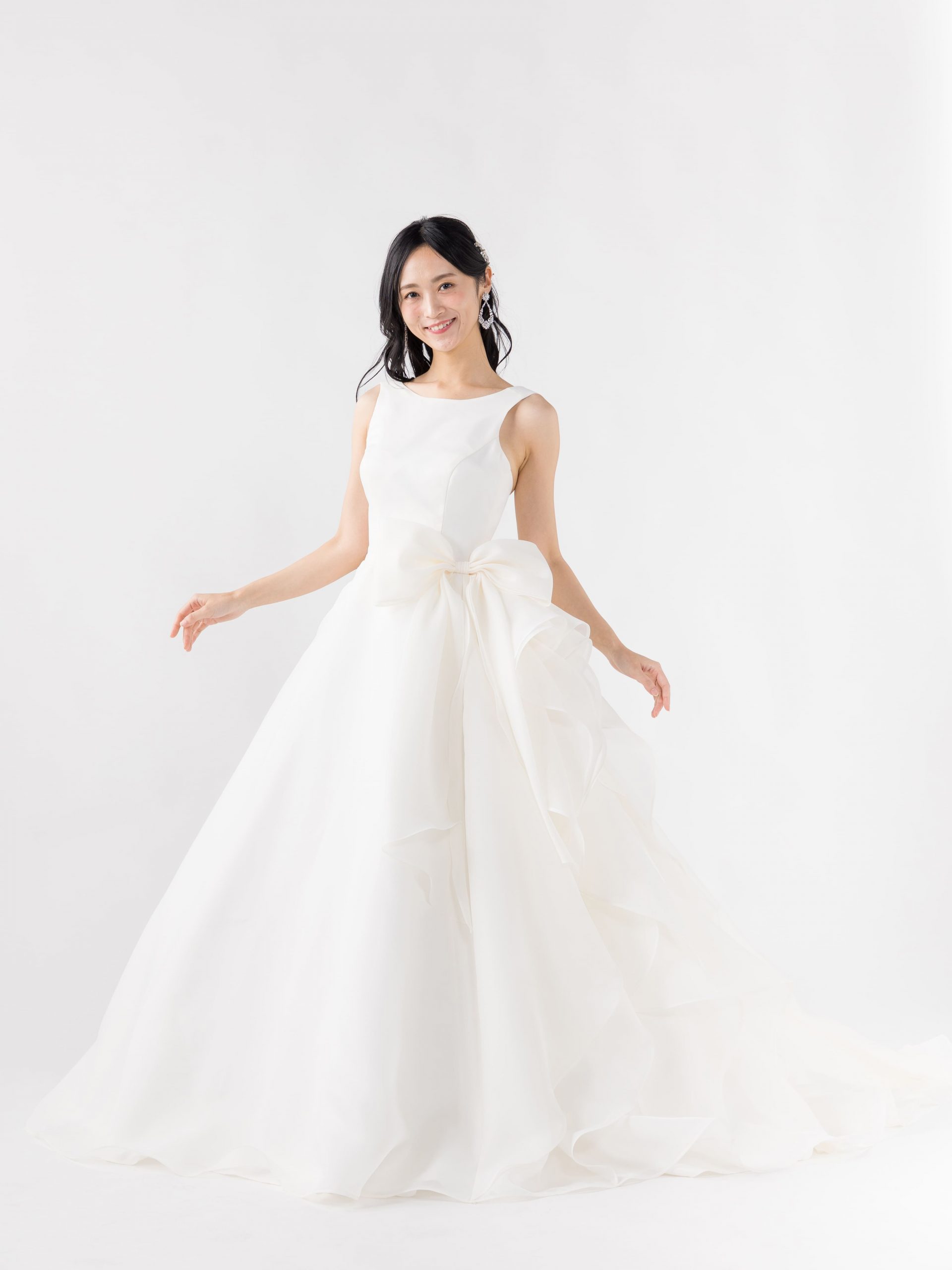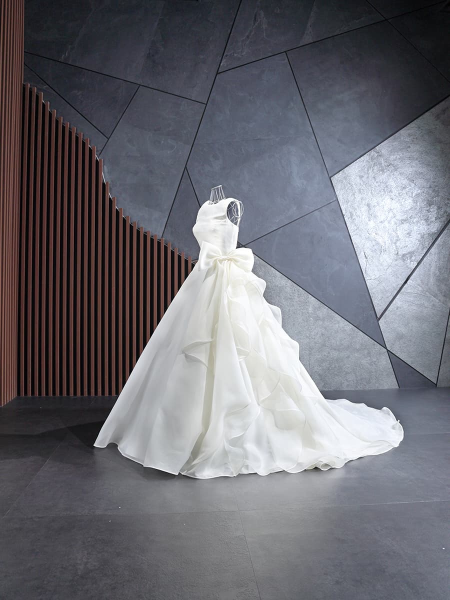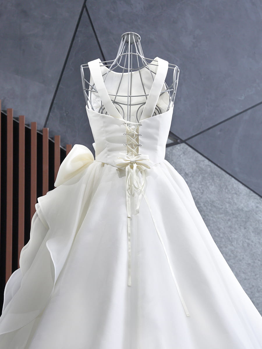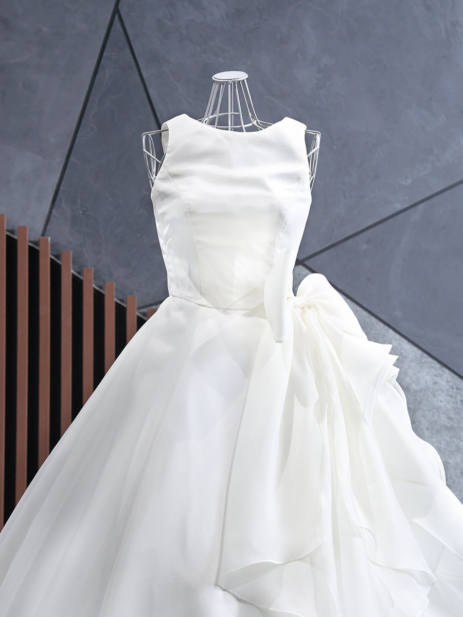 人気のアシンメトリーデザインで、いろいろな角度からお楽しみいただけます。腰回りに大きめのリボンを装飾することで、スタイルアップと小顔効果が期待できます。胸元のカットは浅めに作られており、ノースリーブタイプとなっておりますので、どのようなシーンでも安心しながらお召しいただけます。