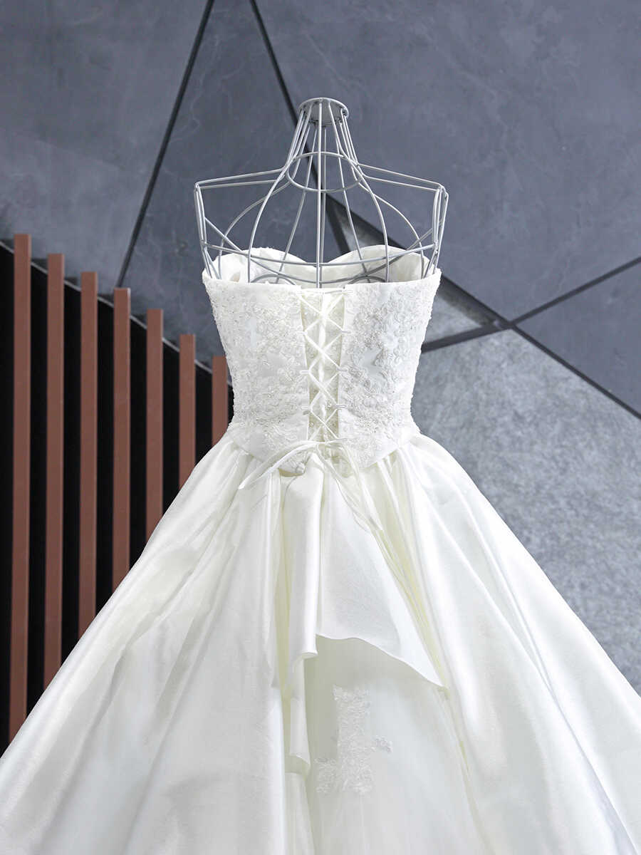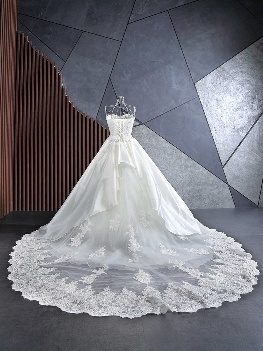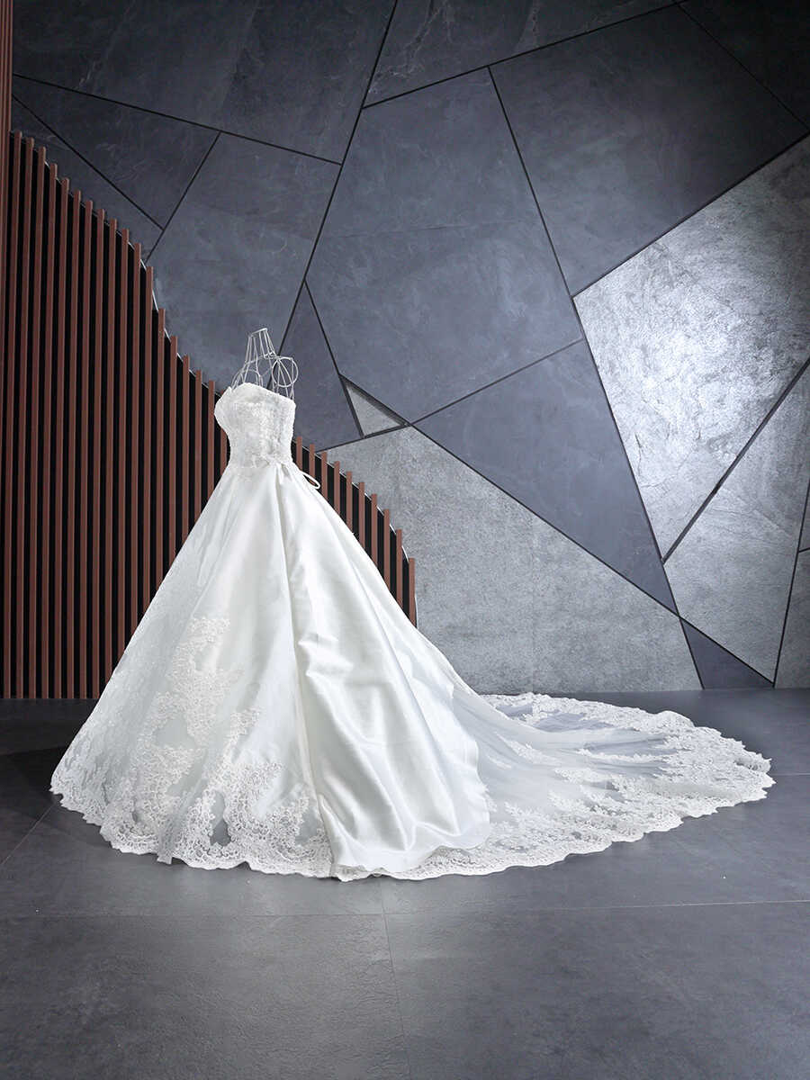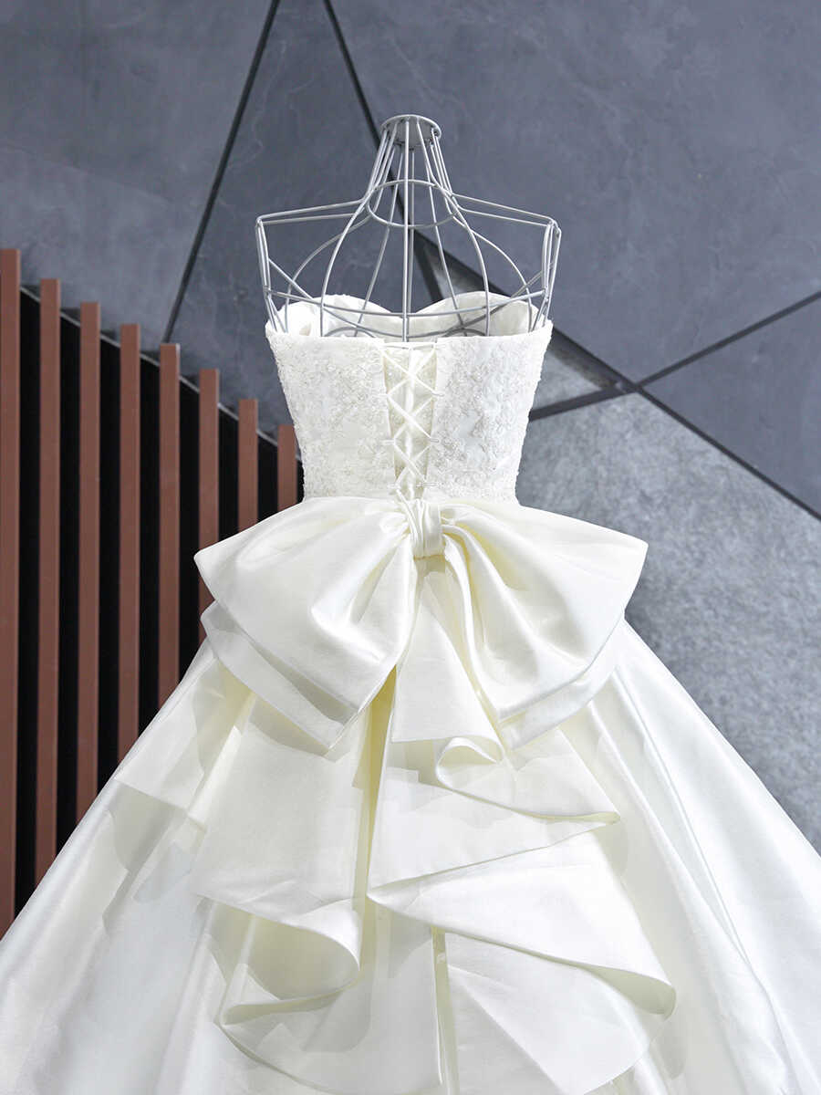 胸元はハートシェイプカットに細かいビジューが豪華にあしらわれています。 アップショットでも胸元のビジューが豪華に映ります。 ゴールドの刺繍が施されたロングトレーンが美しさを際立たせてくれます。
