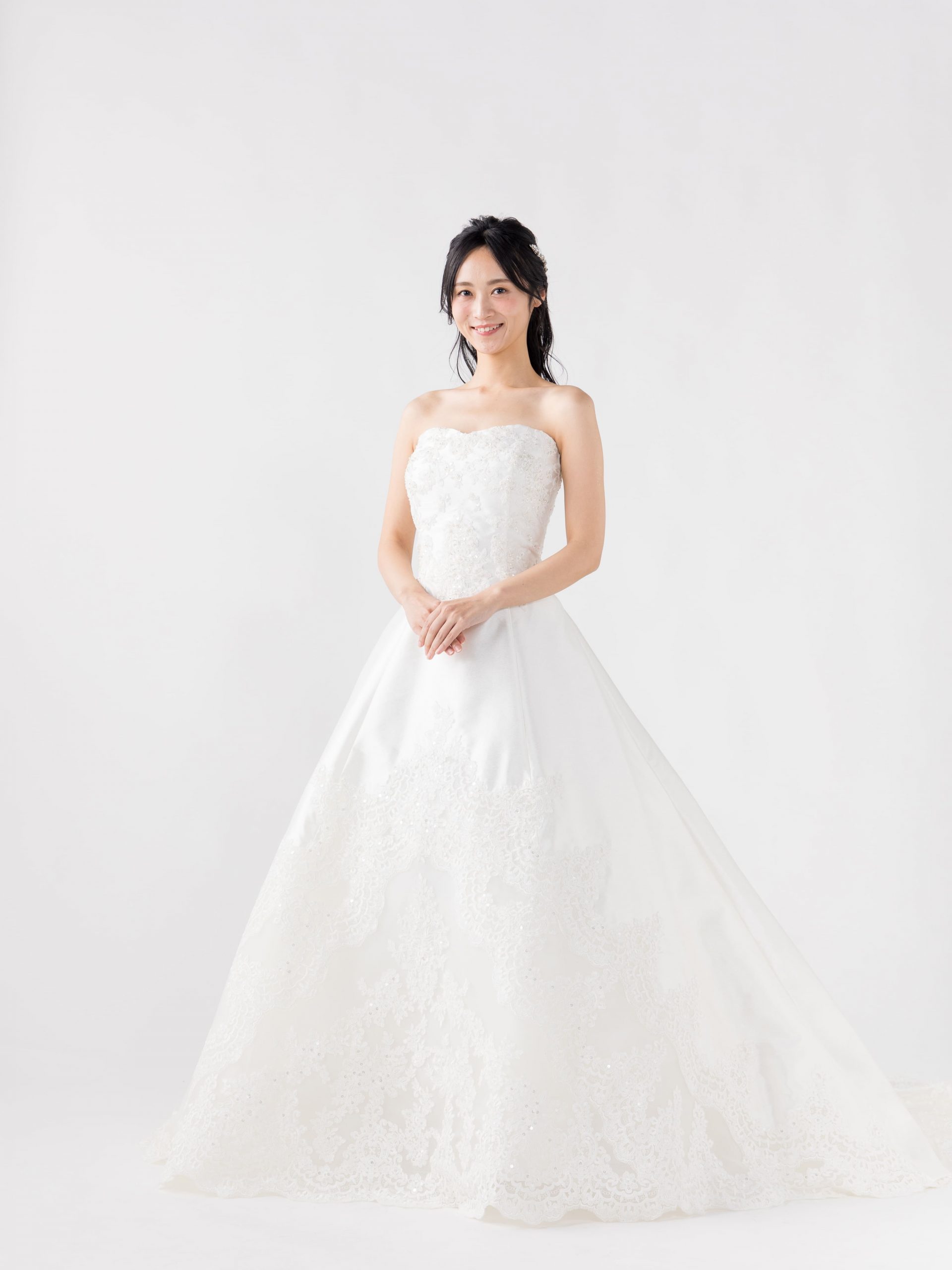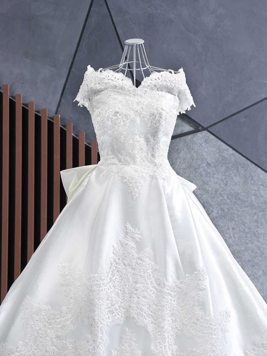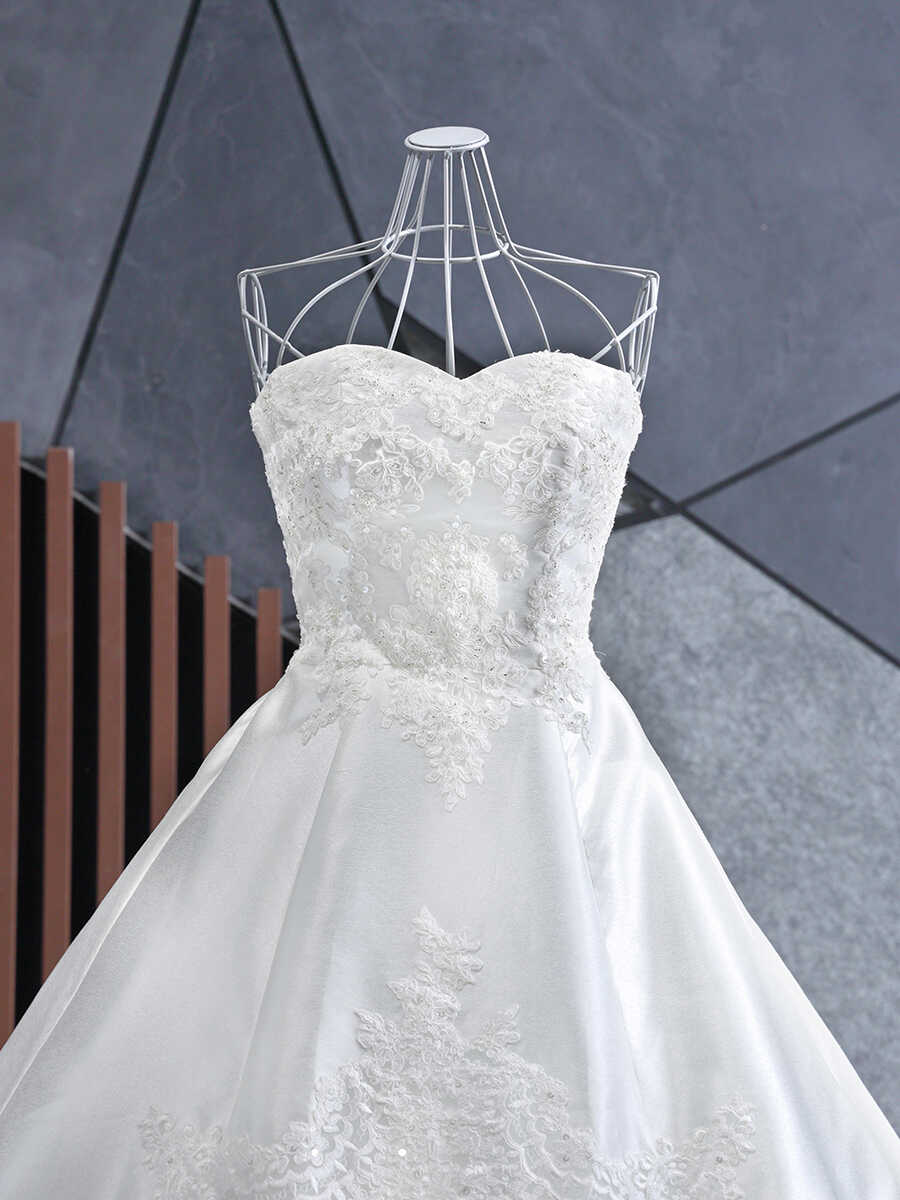 胸元はハートシェイプカットに細かいビジューが豪華にあしらわれています。 アップショットでも胸元のビジューが豪華に映ります。 ゴールドの刺繍が施されたロングトレーンが美しさを際立たせてくれます。