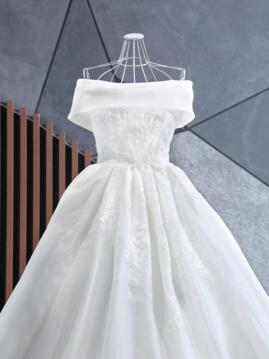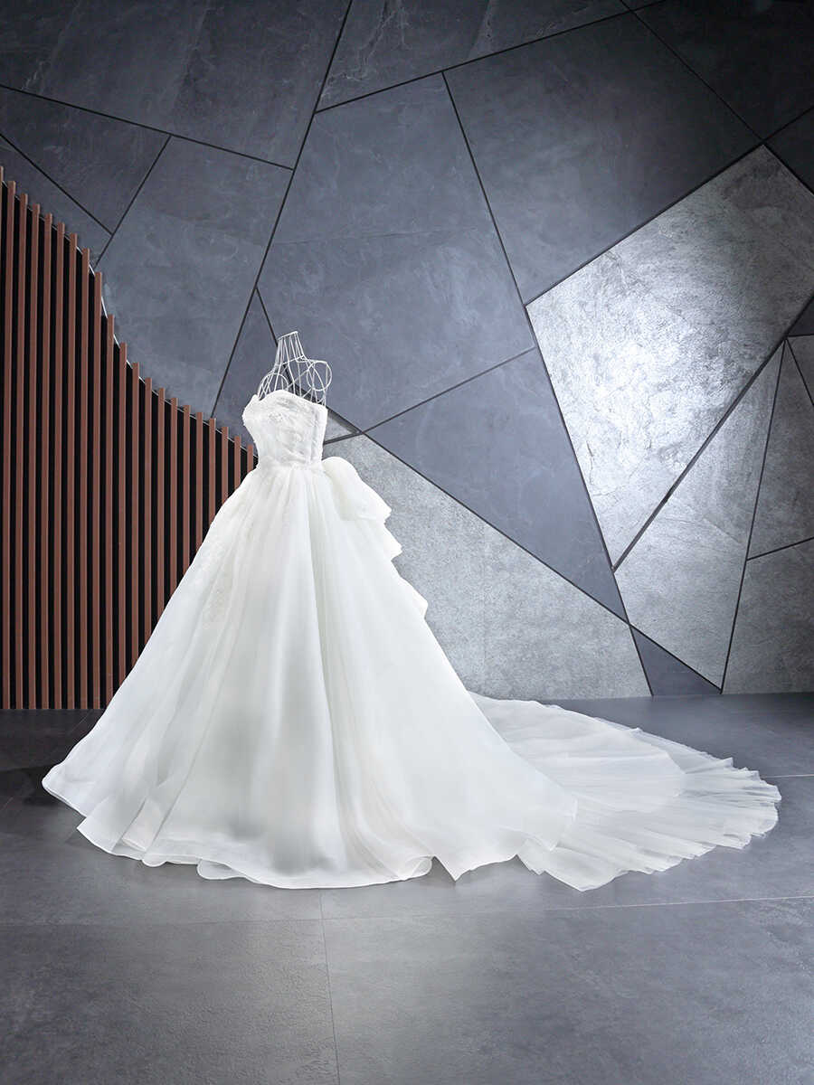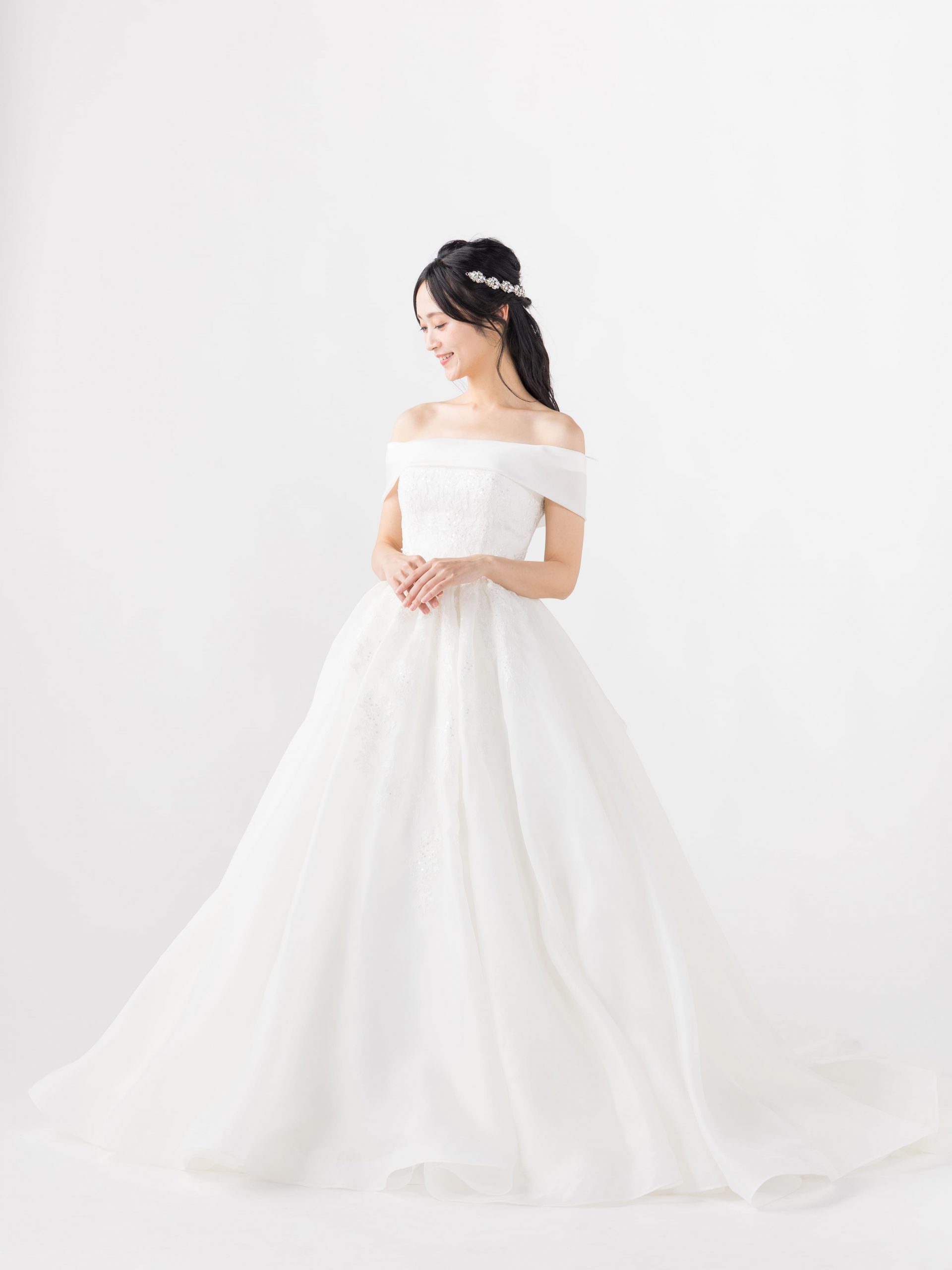 全体的なソフトオーガンジー素材が、女性らしさを醸し出してくれる1着。計算されたオフショルダーの部分がしっかりと二の腕をカバーし、コンプレックスを感じさせません。背面には、センター部分からトレーンにかけてチュール素材を使用しておりますので、1着で2つの異なる素材感のコントラストをお楽しみいただけます。