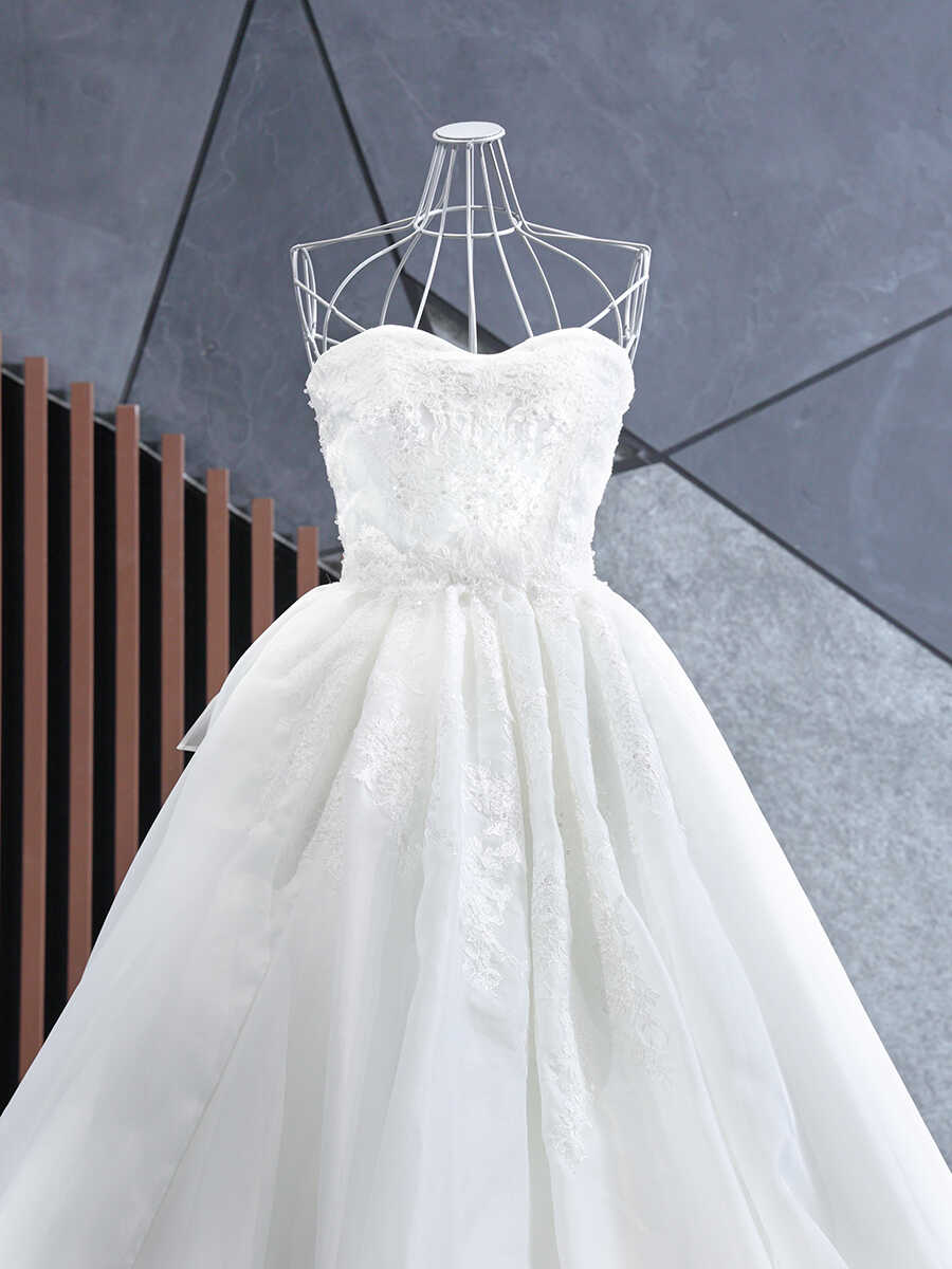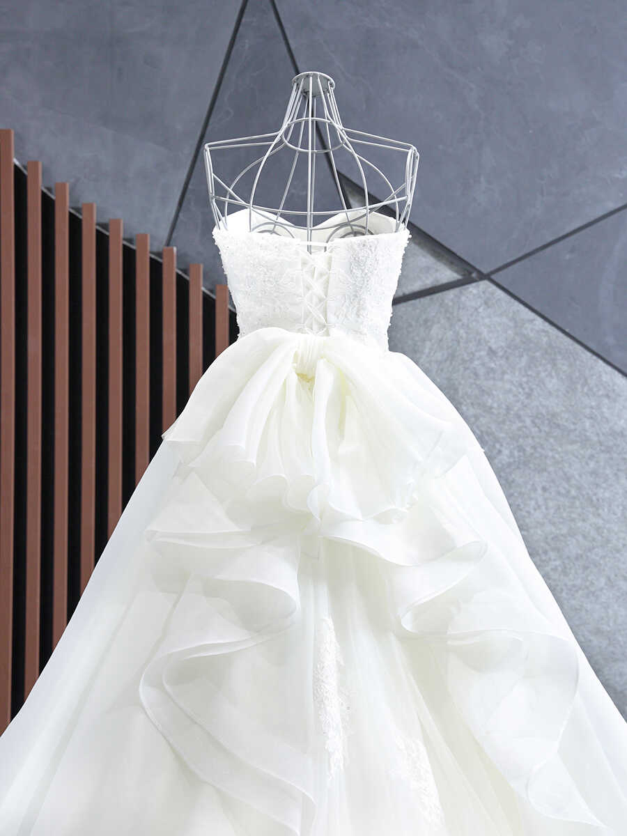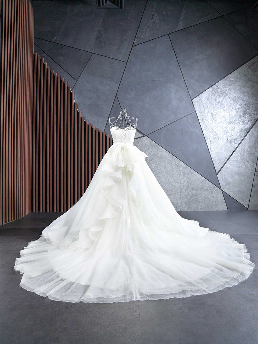 全体的なソフトオーガンジー素材が、女性らしさを醸し出してくれる1着。計算されたオフショルダーの部分がしっかりと二の腕をカバーし、コンプレックスを感じさせません。背面には、センター部分からトレーンにかけてチュール素材を使用しておりますので、1着で2つの異なる素材感のコントラストをお楽しみいただけます。