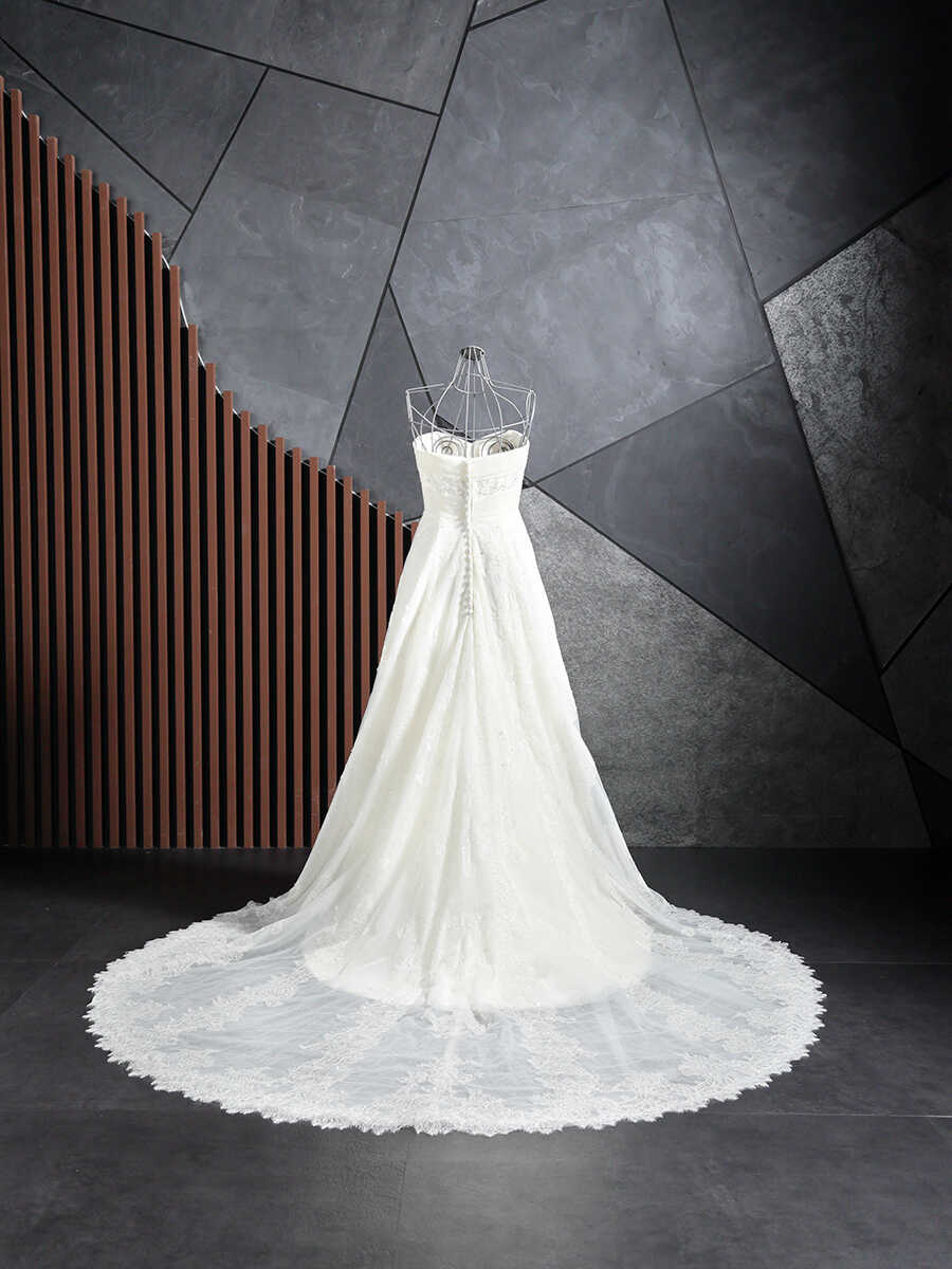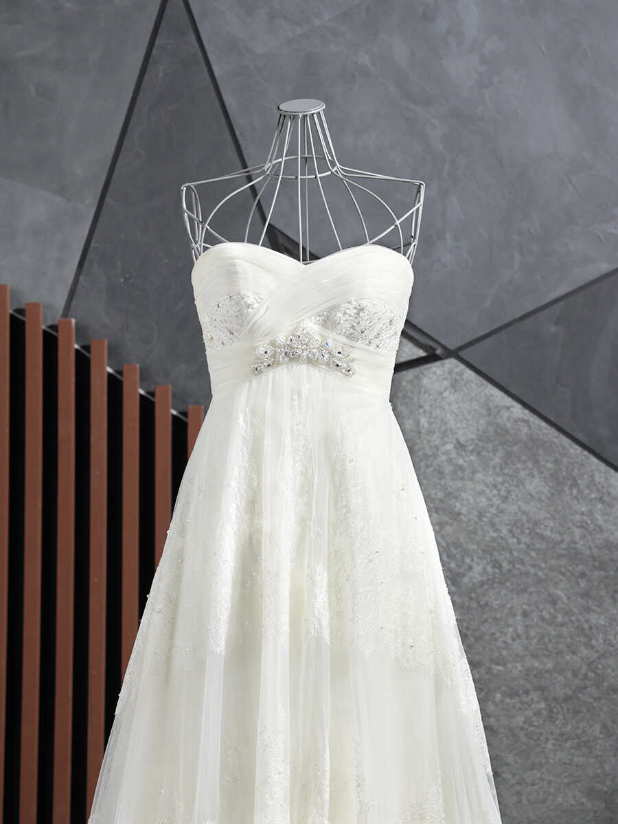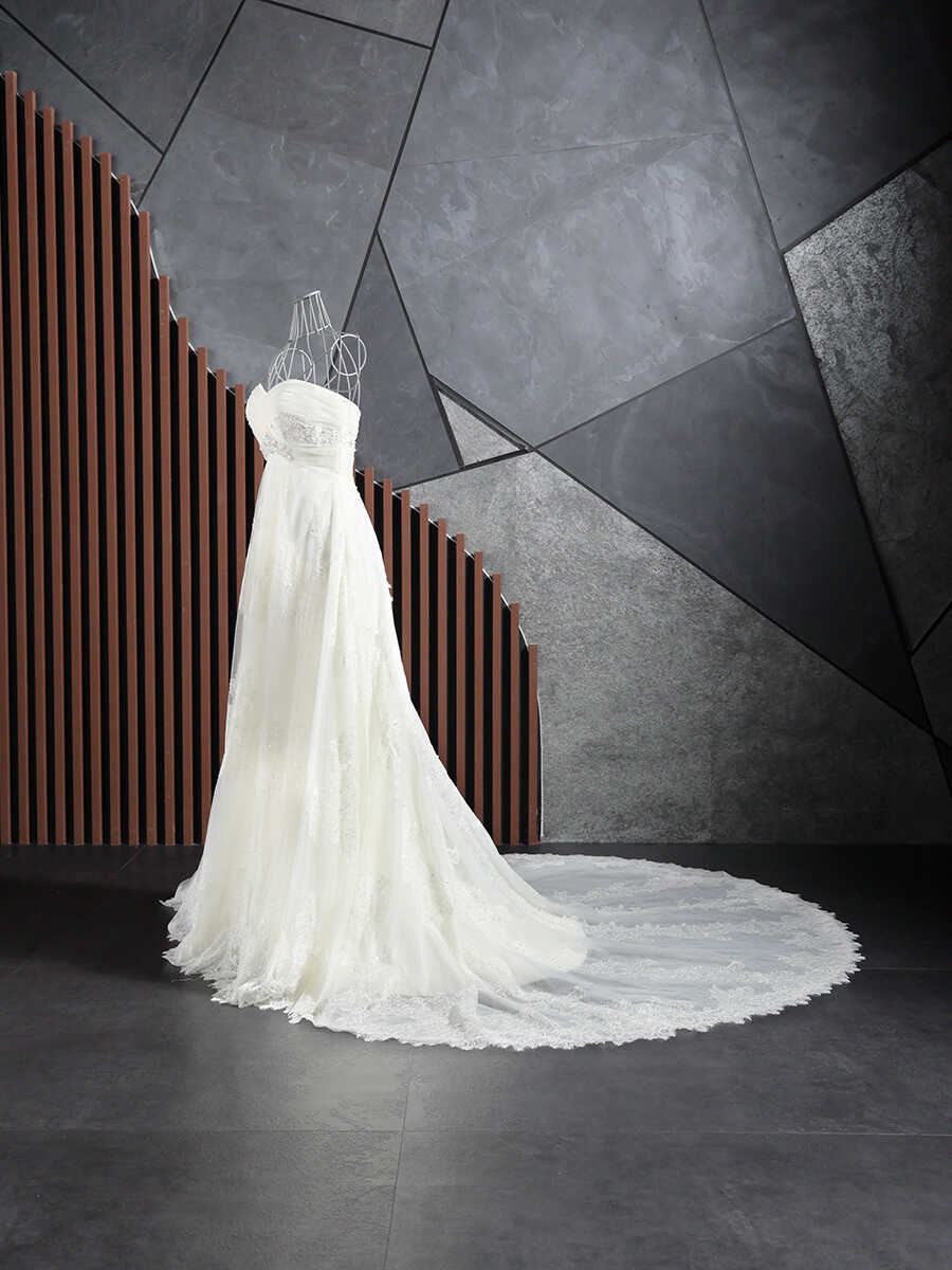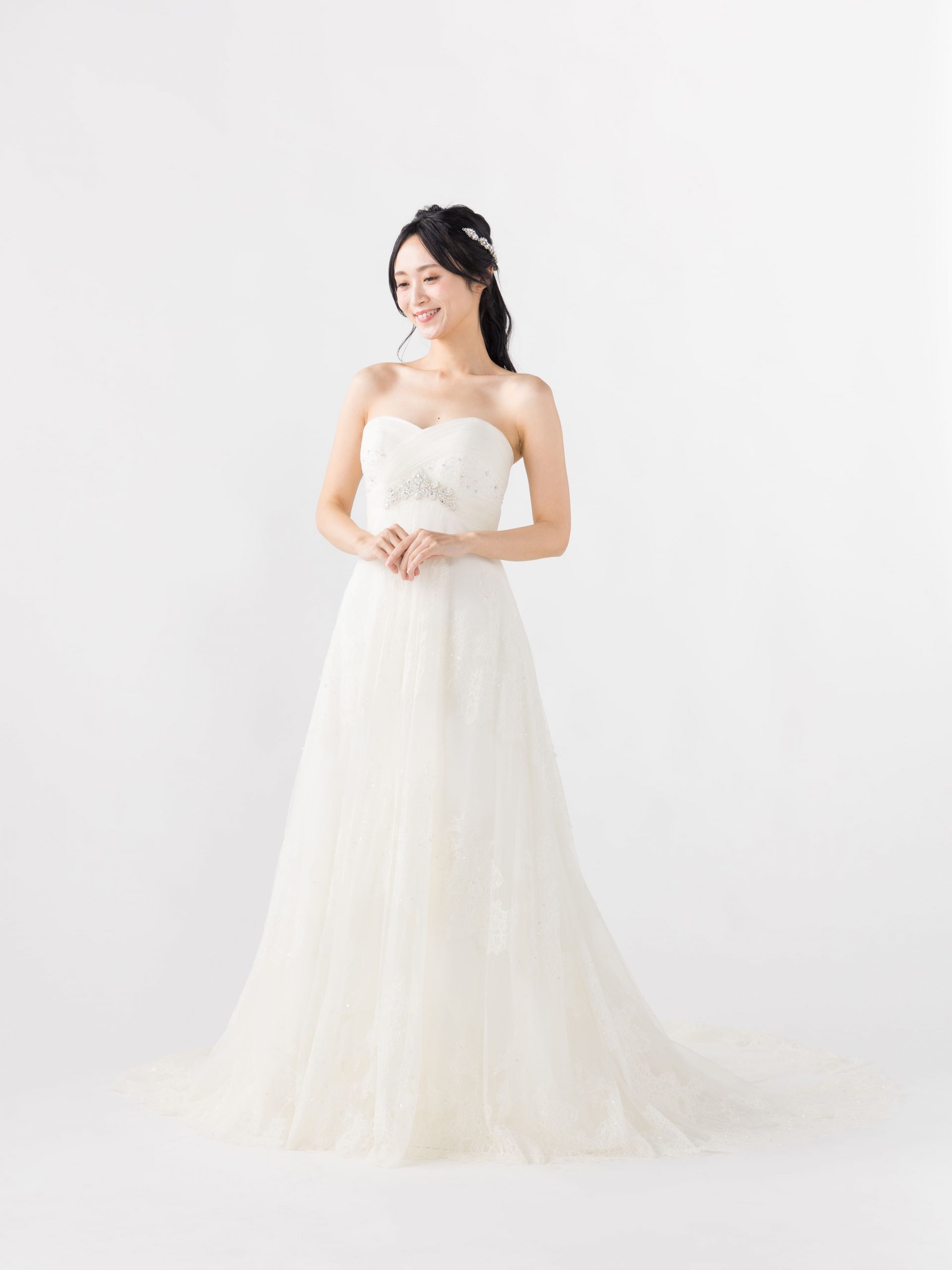 全体的にすっきりとした印象でお召しいただけるエンパイアラインのドレスです。こだわり抜いたレースの刺繍と、裾部分のシャギーカットが目を引きます。胸元のカシュクールデザインがこなれ感を演出。スタイルアップを叶えながらも、自分らしさを大切にしたい花嫁様にぴったりの1着です。
