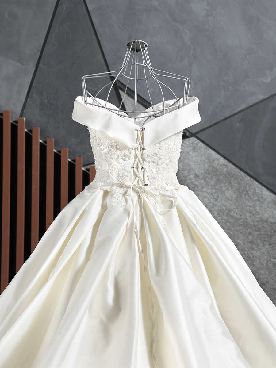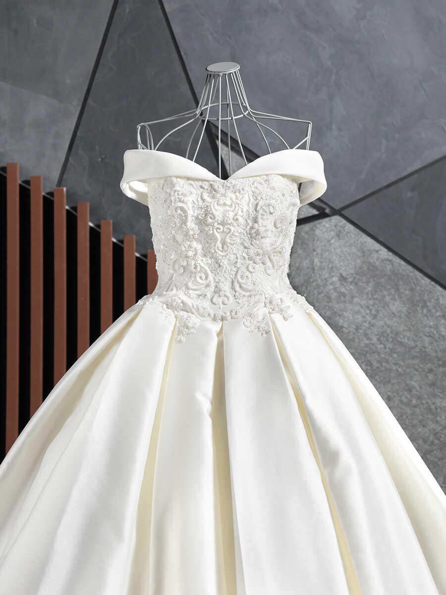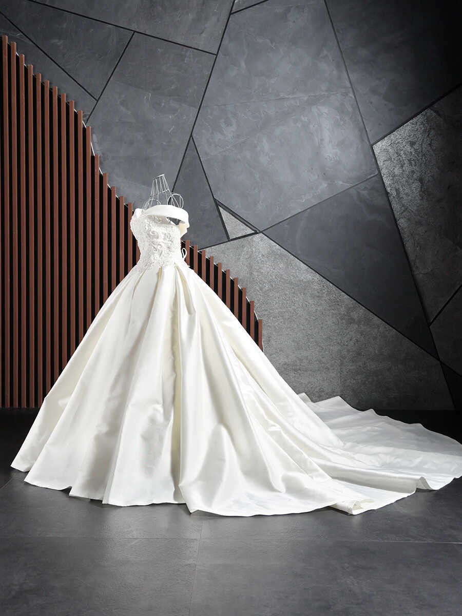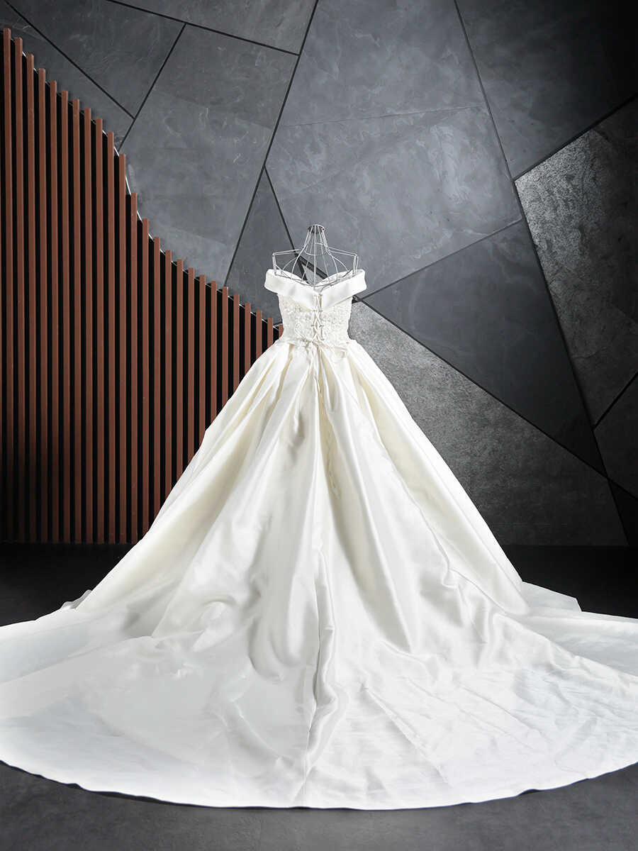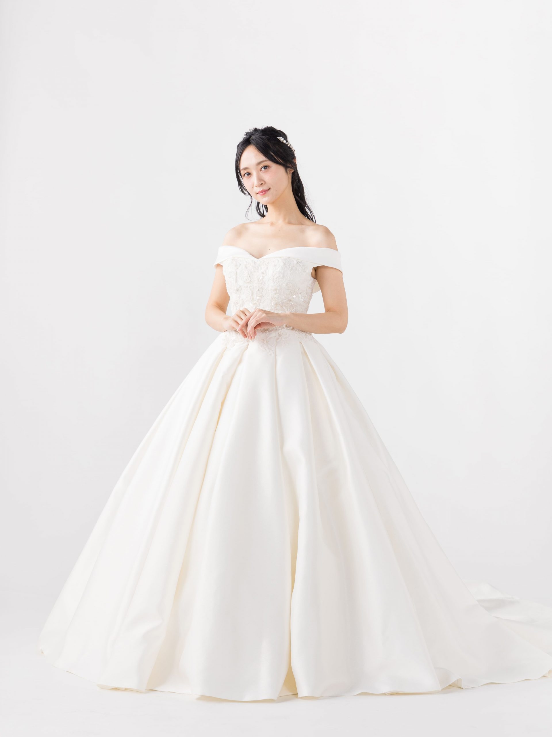 オフショルダーと胸元のカットが上品な可憐さを演出。上質なサテン地が醸し出す重厚感と、プリンセスラインならではの可愛らしい印象もお楽しみいただけます。こだわり抜いたシルエットとデザインが、花嫁様の愛らしさを存分に引き立たせてくれます。